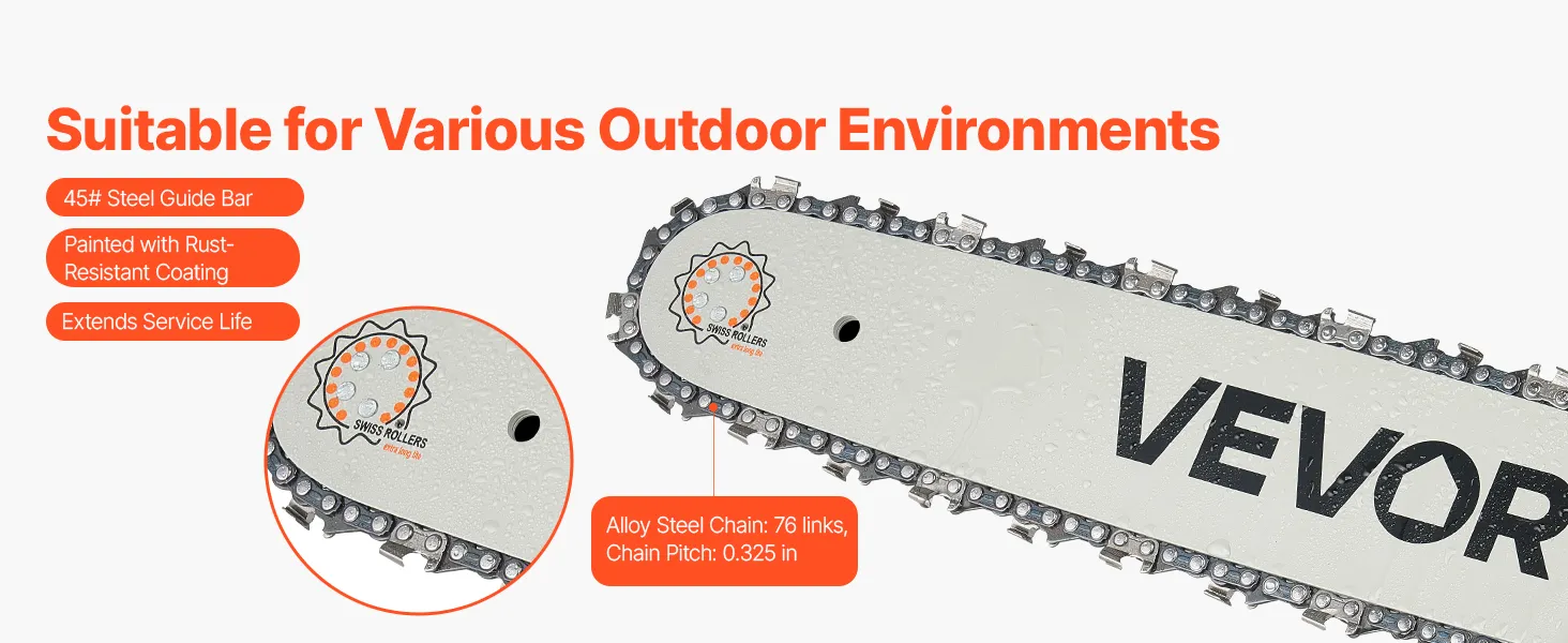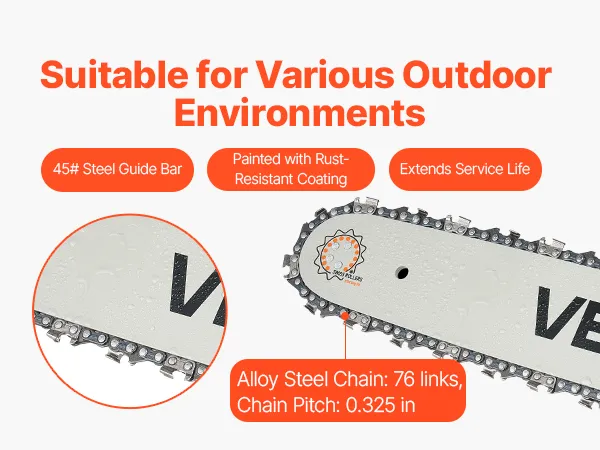 A: The chain is made of alloy steel, with a total of 76 links and a chain pitch of 0.325 in.