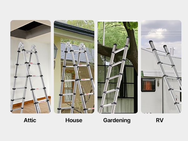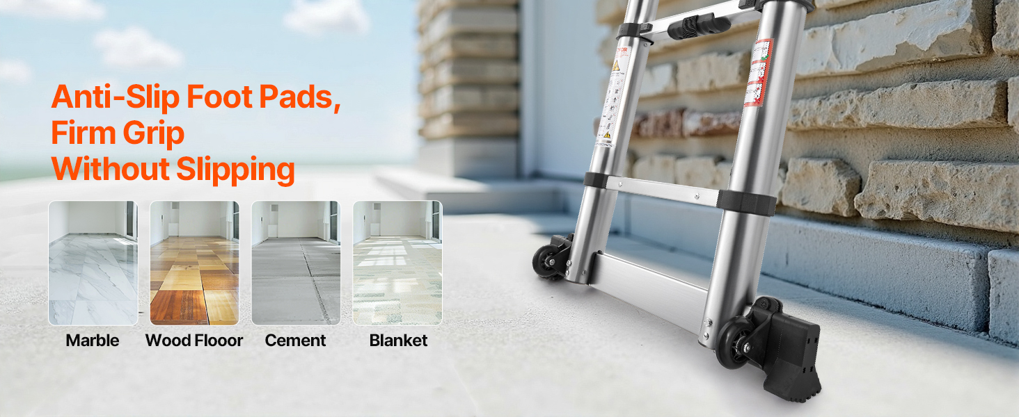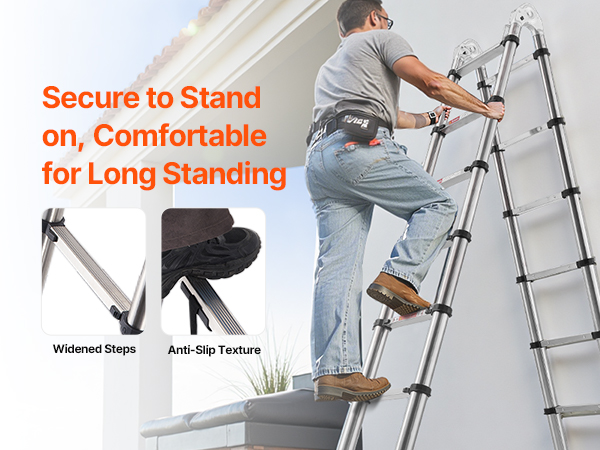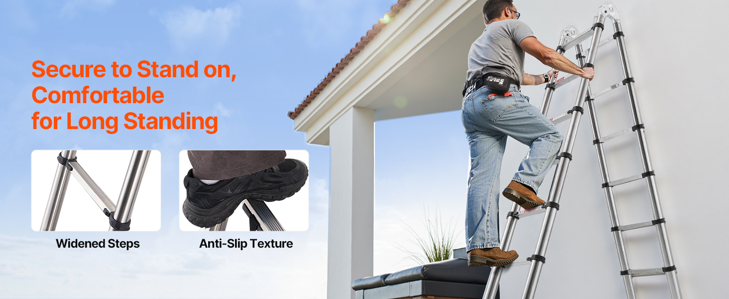 Made with durable steel and nylon connectors for extra strength, this A-frame ladder provides stability for both home and commercial use with 330 lbs / 150 kg load capacity. The multi-button retraction design ensures simple operation. Wide steps offer comfort and stability, making high-altitude tasks easier.