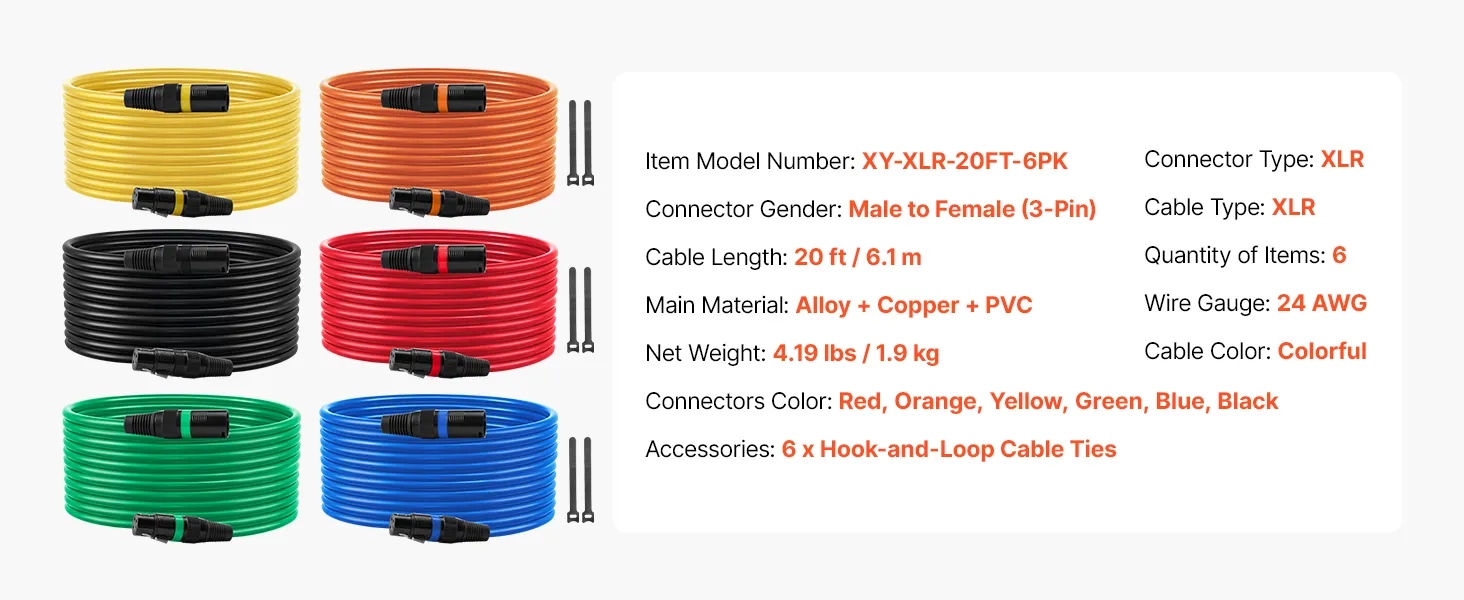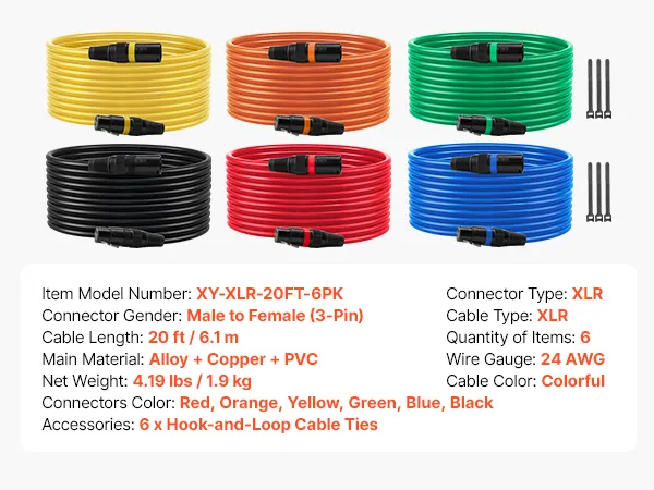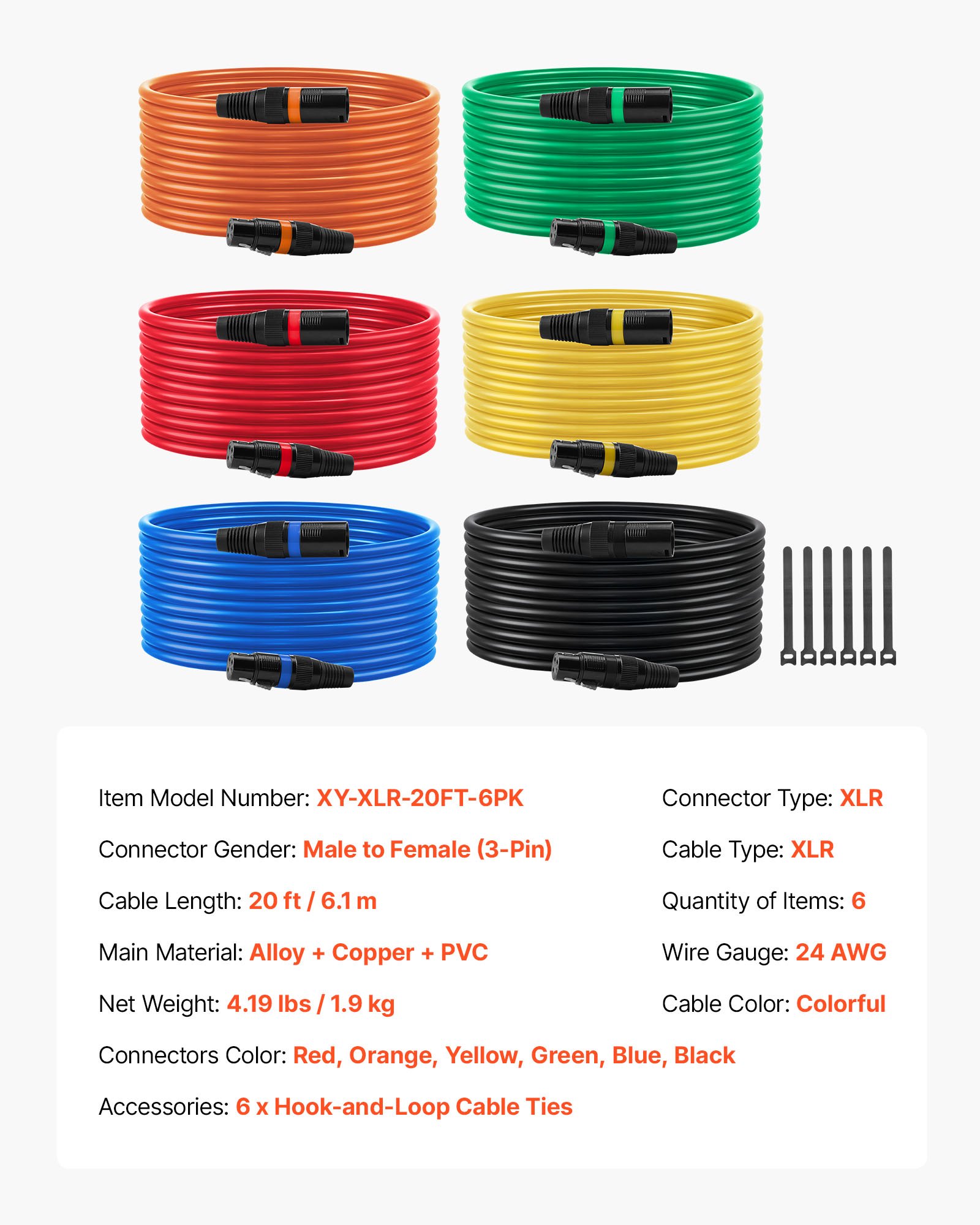 VEVOR XLR Cable 6.1 m, 6 Pack, Shielded Balanced DMX Male to Female Microphone Cables, Gold-Plated 3-Pin XLR Mic Speaker Cord Wires, for Stage Lighting, Microphones, Amplifier, Mixer, Speaker Systems