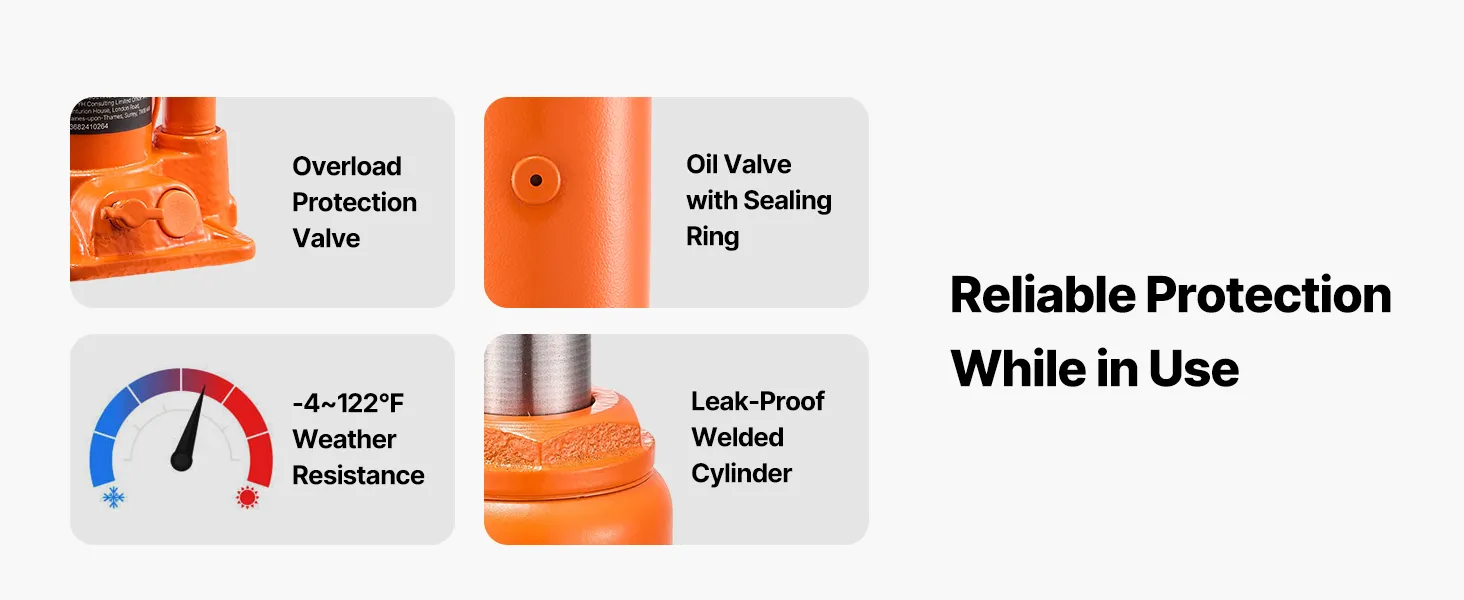 This bottle jack is designed with a reinforced wide base to reduce the risk of tilting, tipping, or base deformation.