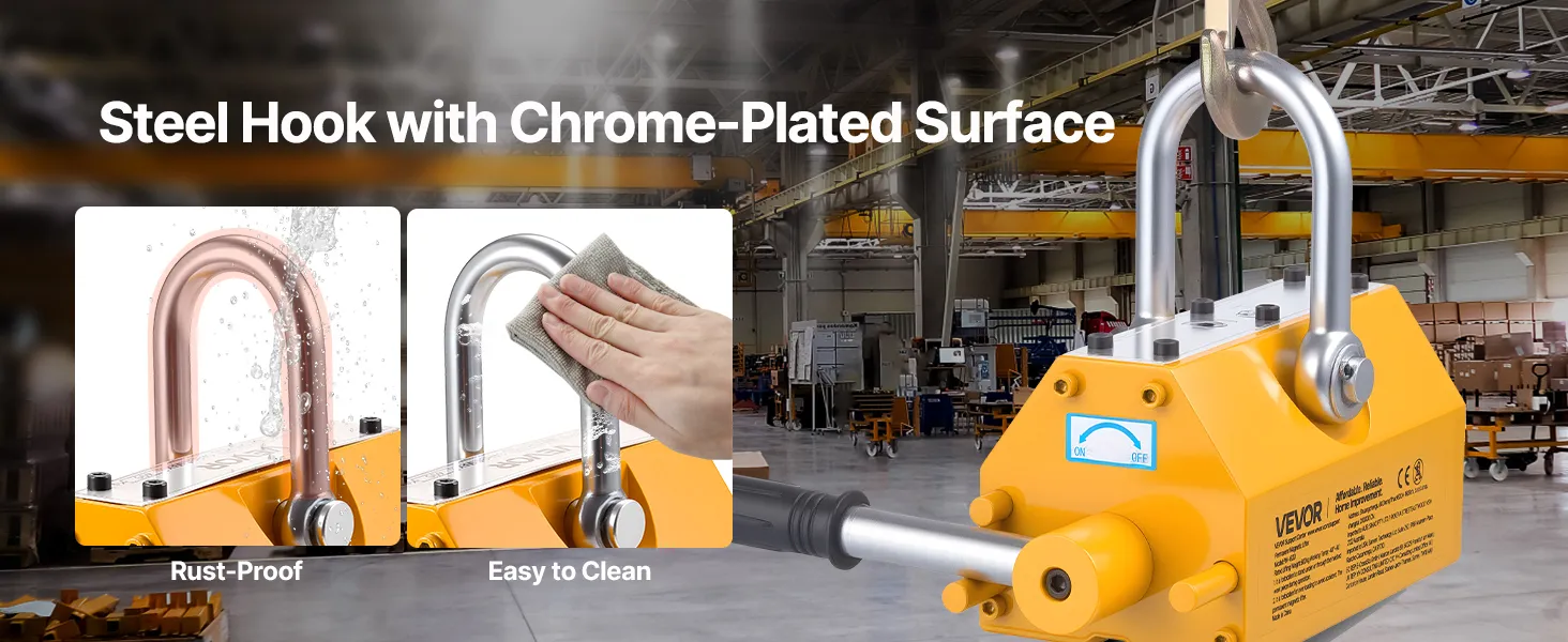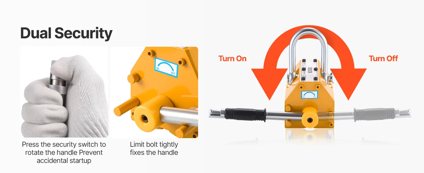 Our lift magnets feature easy one-handed operation. Switches magnetic force without electricity—turn left to activate strong magnetism, turn right to release.