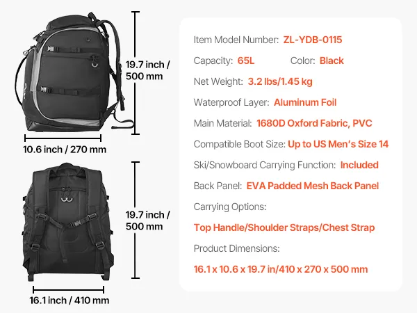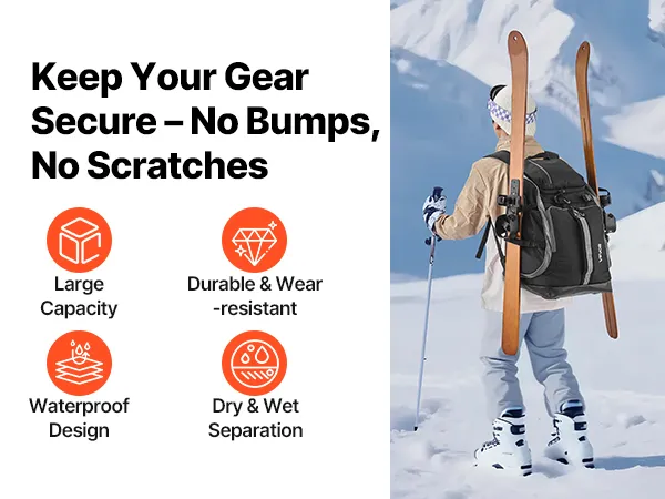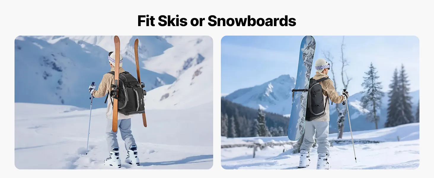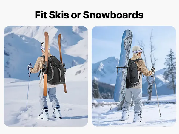 Our ski boot backpack fits snowboards and skis. Made of waterproof and wear-resistant Oxford fabric, with a standing mat and EVA-padded back panel, multiple compartments, it ensures organized storage and easy access. Fit boots and gear in one bag.