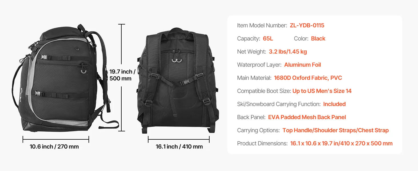 VEVOR Ski Boot Bag Snowboard Boots Travel Backpack 55L Waterproof Oxford Black