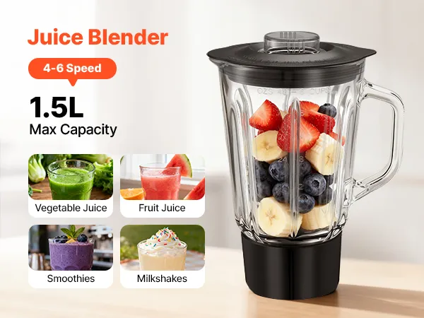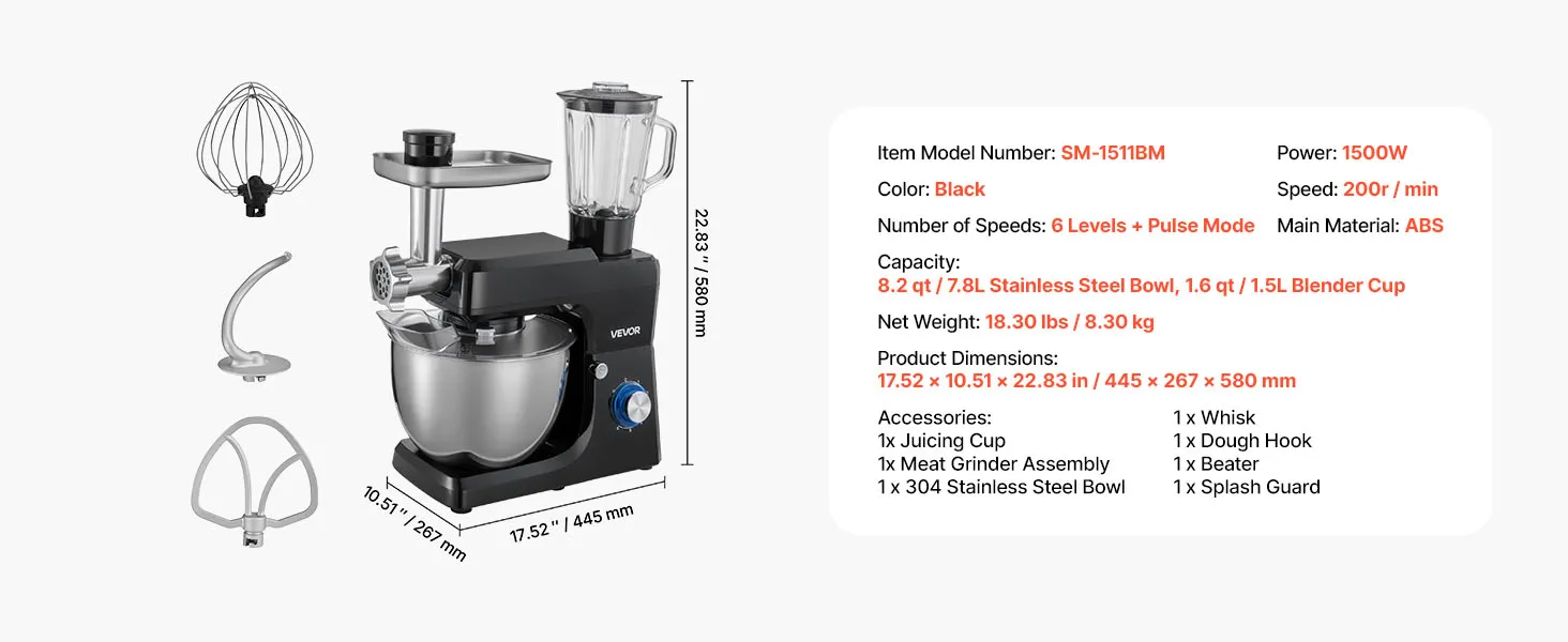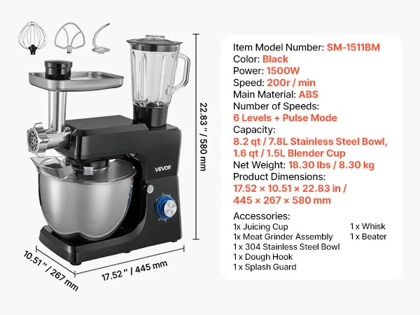 VEVOR Stand Mixer, 7.8 L Electric Kitchen Mixer, 1500W Dough-Mixer, 6+P Speeds Tilt-head Food-Mixer with 1.5 L Blender Cup, Stainless Steel Bowl, Dough Hook, Whisk, Beater, for Baking, Mixing, Black