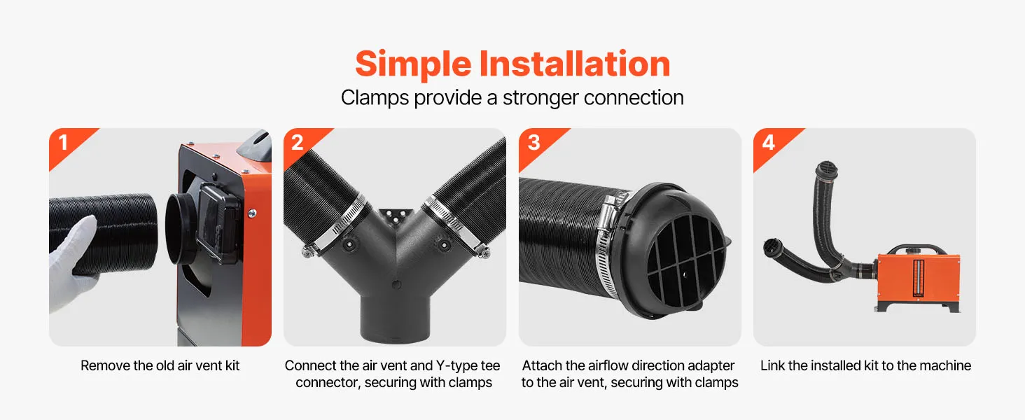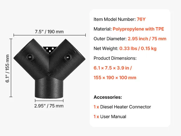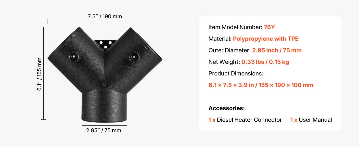 • Durable Y-Shaped Adapter: Our y-piece diesel heater duct connector enhances airflow and improves warm air delivery where needed. It offers an easy way to manage air distribution and is suitable for a variety of installation and maintenance requirements for diesel heaters
