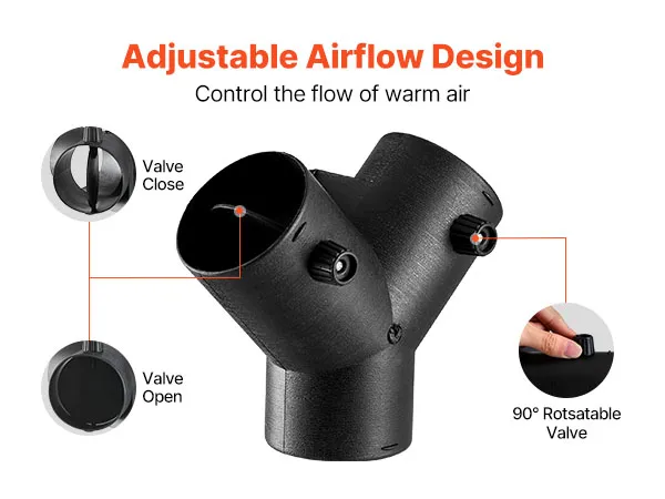 • Flexible Airflow Controller: The diesel heater duct connector accessories feature a T-shape outlet with 90° adjustable valves. This design efficiently directs airflow and allows you to easily select the outlet position for better heating control in various settings