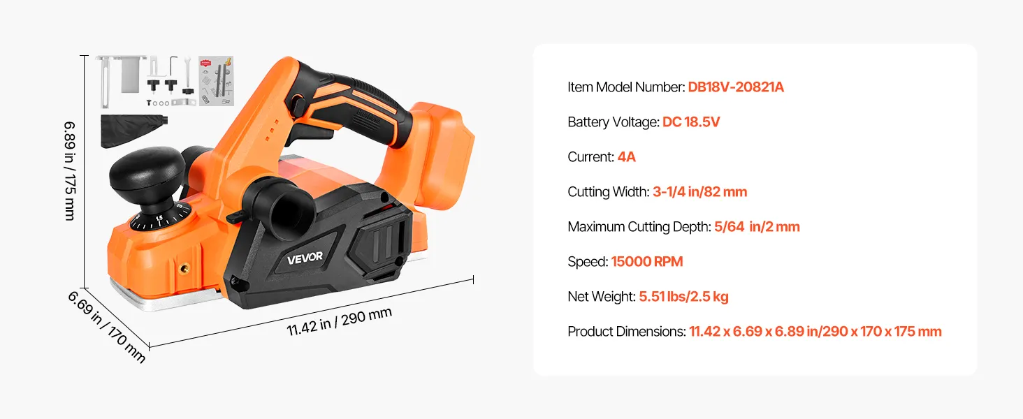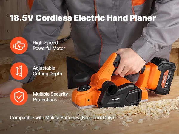 VEVOR Cordless Handheld Planer, 82 mm Cut Width, 15000 RPM Electric Hand Wood Planer with Brushless Motor, Adjustable Cut Depth for Woodworking, Compatible with VEVOR 18V Battery (Bare Tool Only)