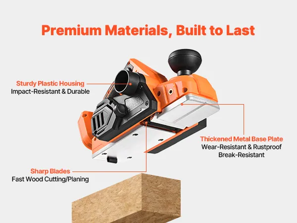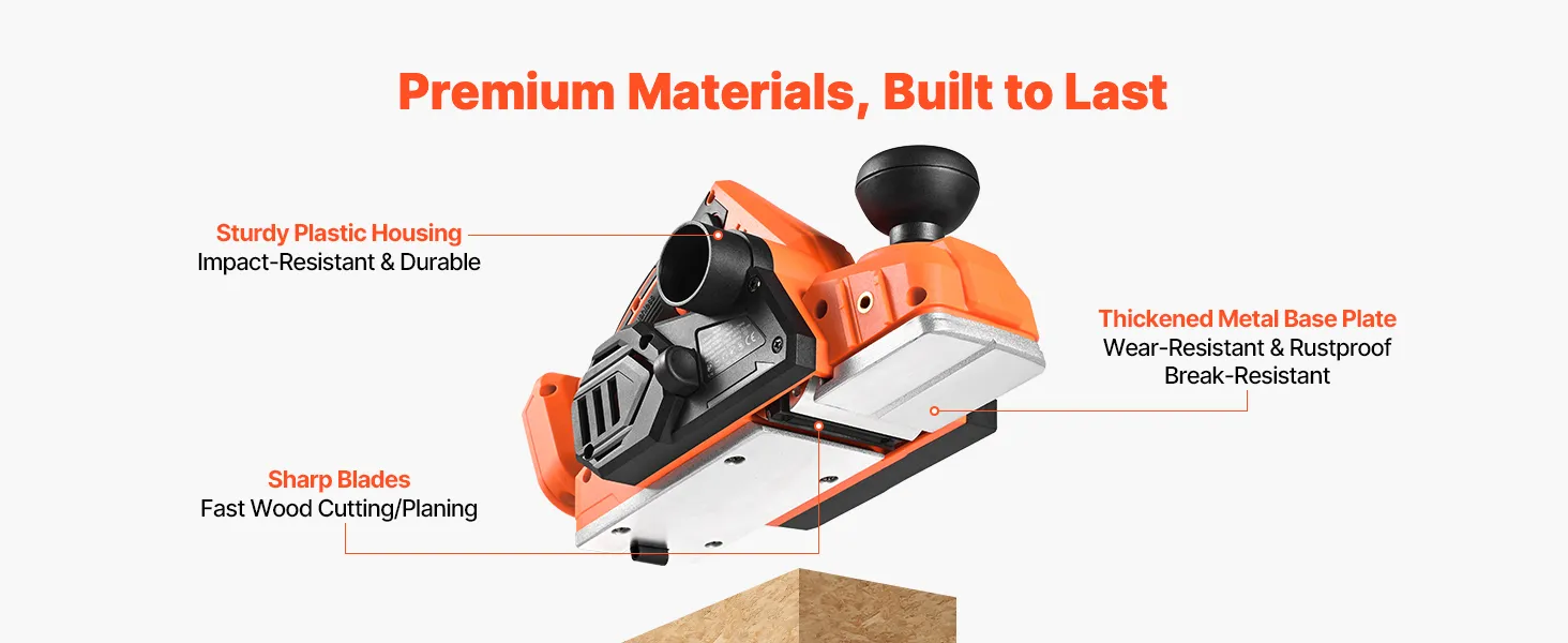 With a powerful motor, our electric hand planer delivers strong performance. The sturdy plastic housing is impact-resistant, while the reinforced metal base plate withstands wear and rust. Sharp blades provide fast cutting and smooth planing, extending service life.