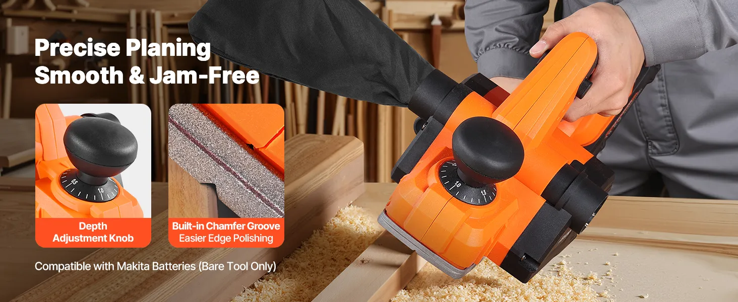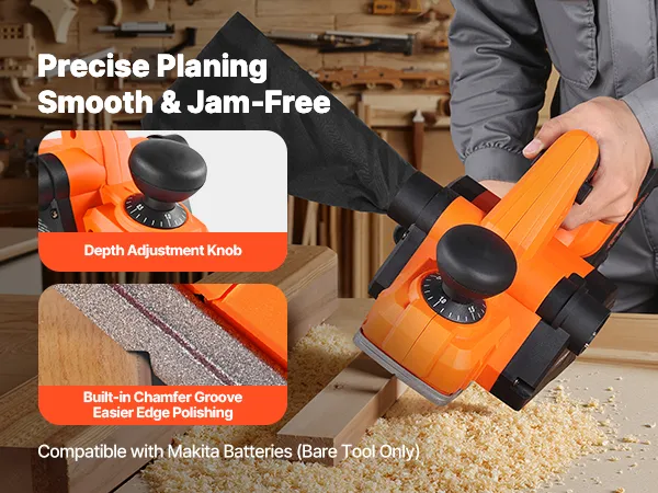 This power handheld planer is equipped with an adjustable depth knob to easily adjust the planing depth. The built-in chamfer groove makes edge polishing easier and smooth planing without jamming, improving work efficiency and quality.