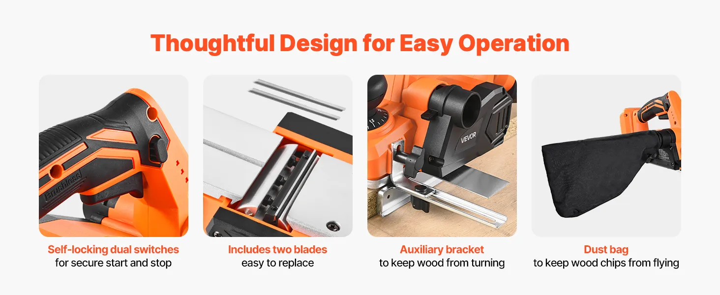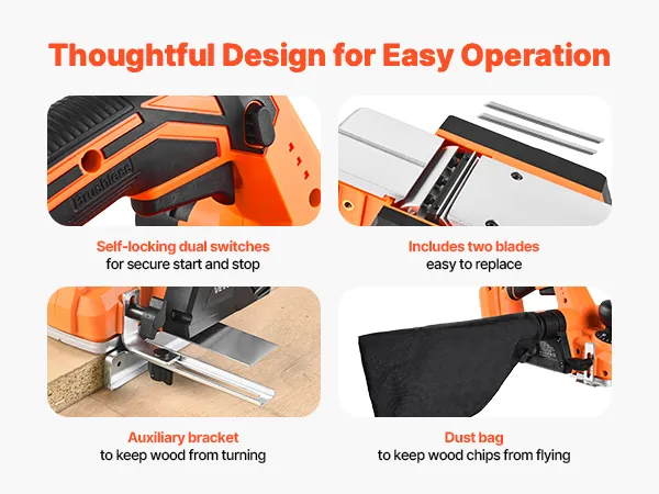 This electric wood planer comes with dual self-lock switches for a secure start and stop. It also includes two blades for simple replacement, making this operation faster and more convenient.