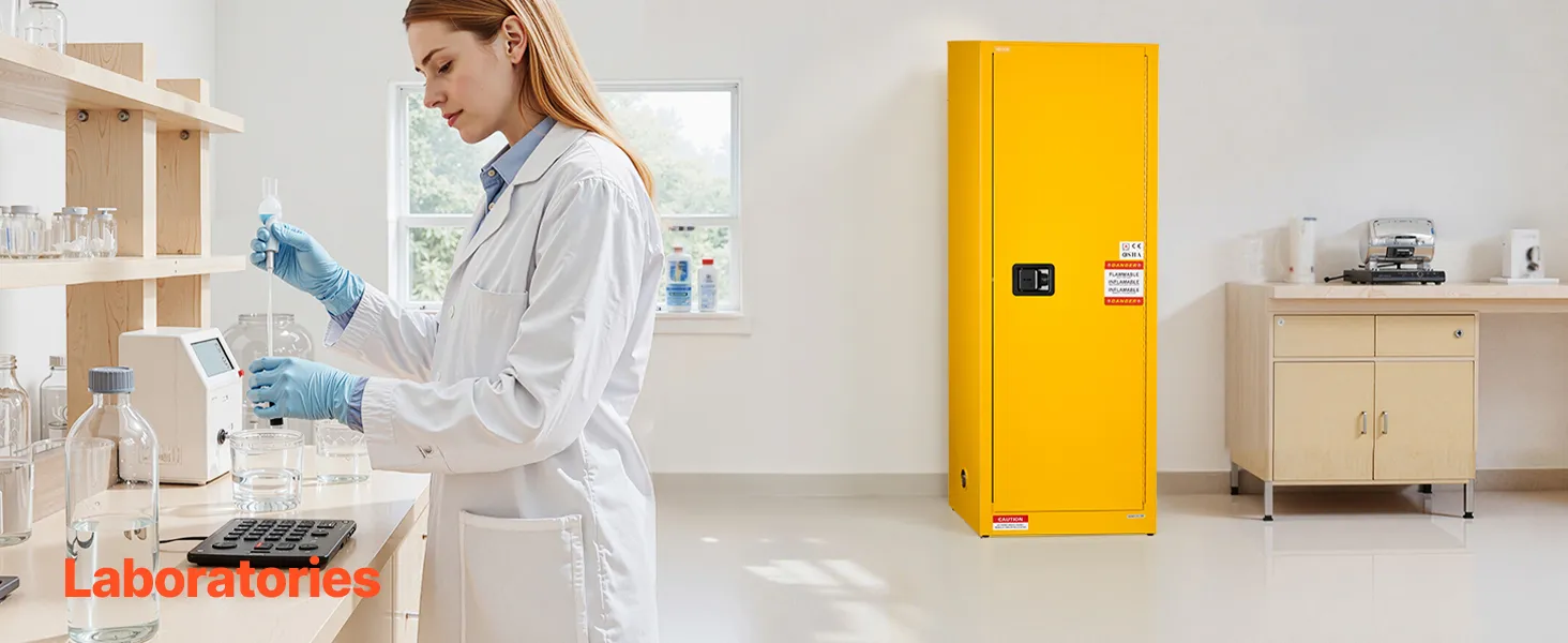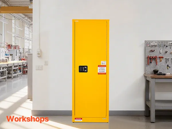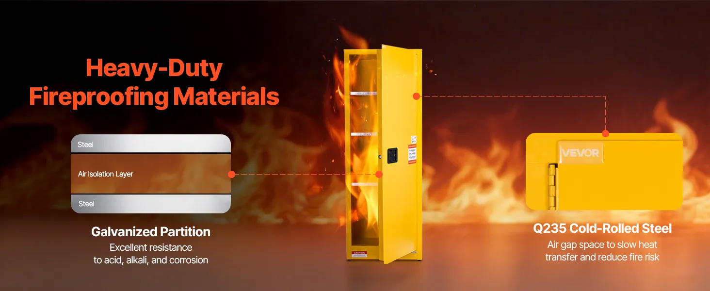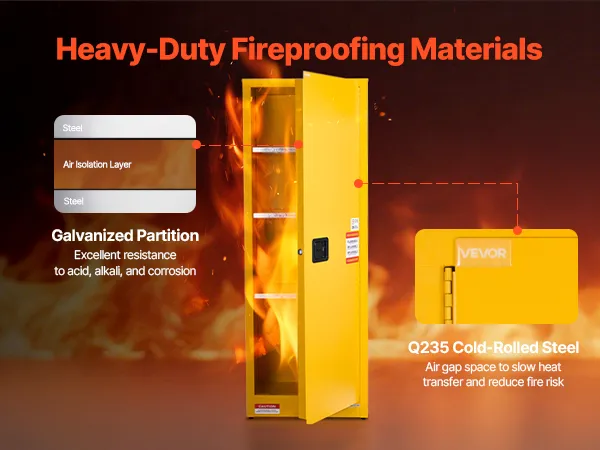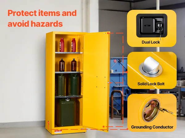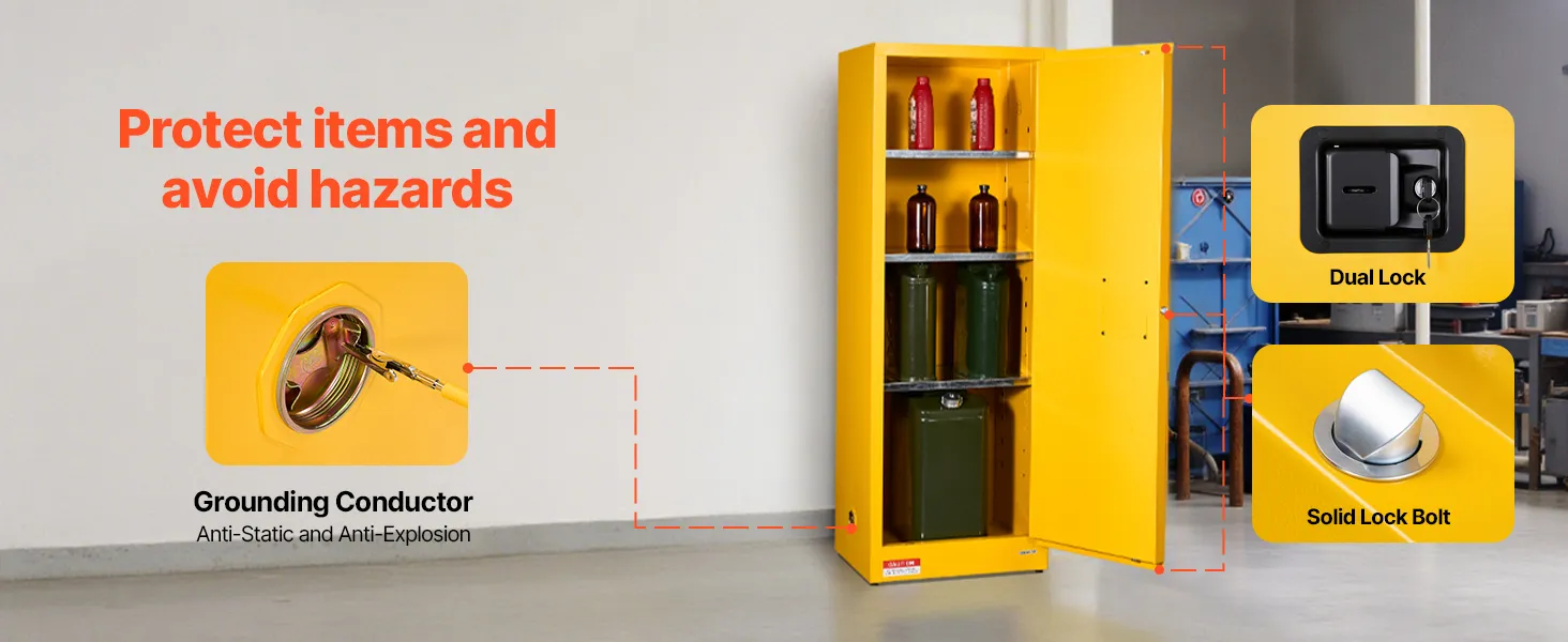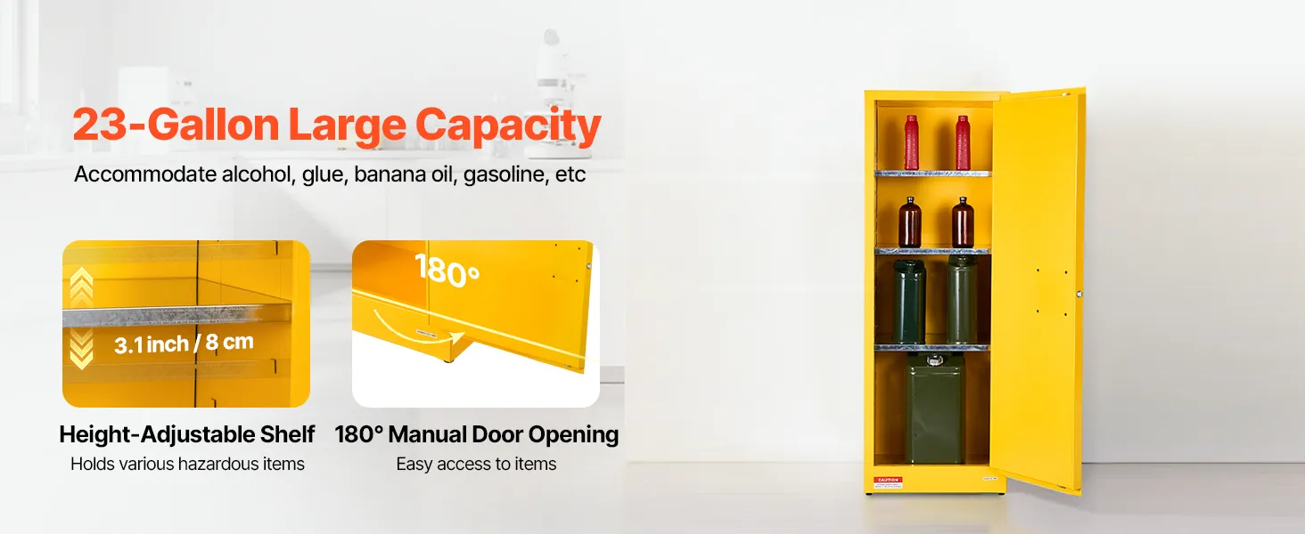 Made of Q235 cold-rolled steel with a welded body, our 23 gallon cabinet is durable and resistant to corrosion and deformation. It features vents, a sump, and a grounding wire for explosion and static prevention. Suitable for storing various flammable materials in workshops, factories, and garages.