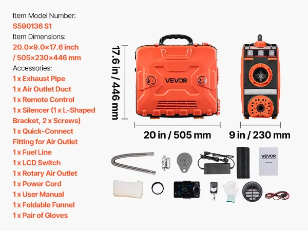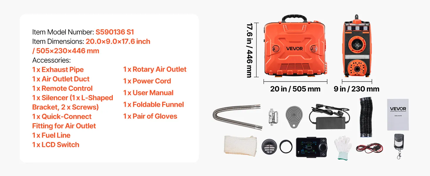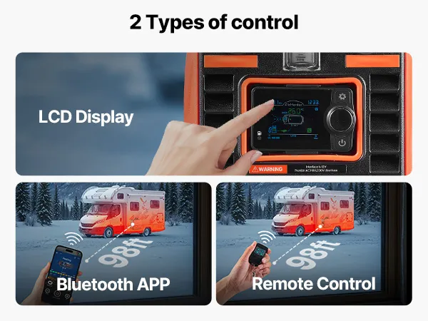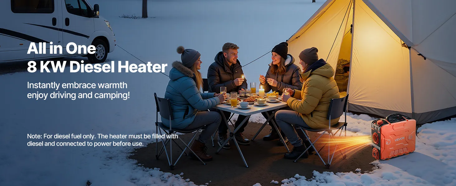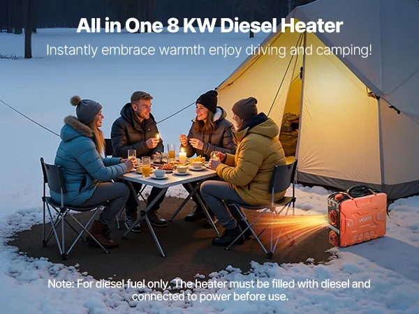 This 8KW portable diesel heater connects to a vehicle power and includes an adapter for power stations or household AC power. It delivers fast and efficient heating for tents, ice fishing, RVs, trucks, SUVs, vans, and more. Designed to handle cold environments, it quickly warms large spaces.
