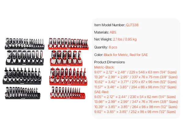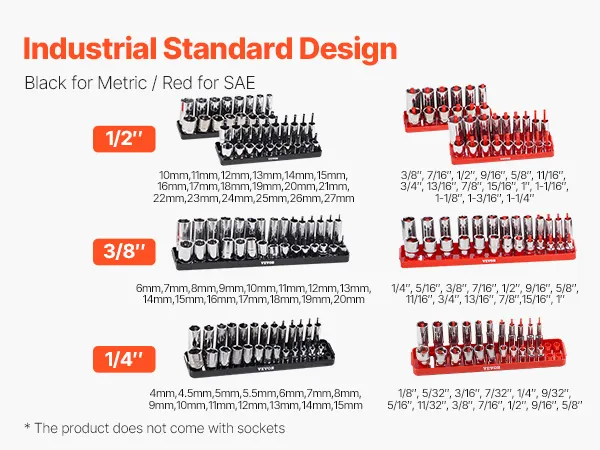 VEVOR Socket Organizer Set, 8PCS High-Rod Socket Holder, 1/4'', 3/8'' & 1/2'' Metric SAE Socket Trays with Clear Labels, Hold up to 176PCS Standard & Deep Sockets, Black & Red (Socket Not Included)