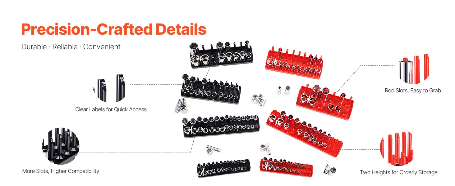 This socket holder is meticulously designed for comfort, convenience, and quality, every aspect—whether accessing or storing tools—reflects careful craftsmanship.