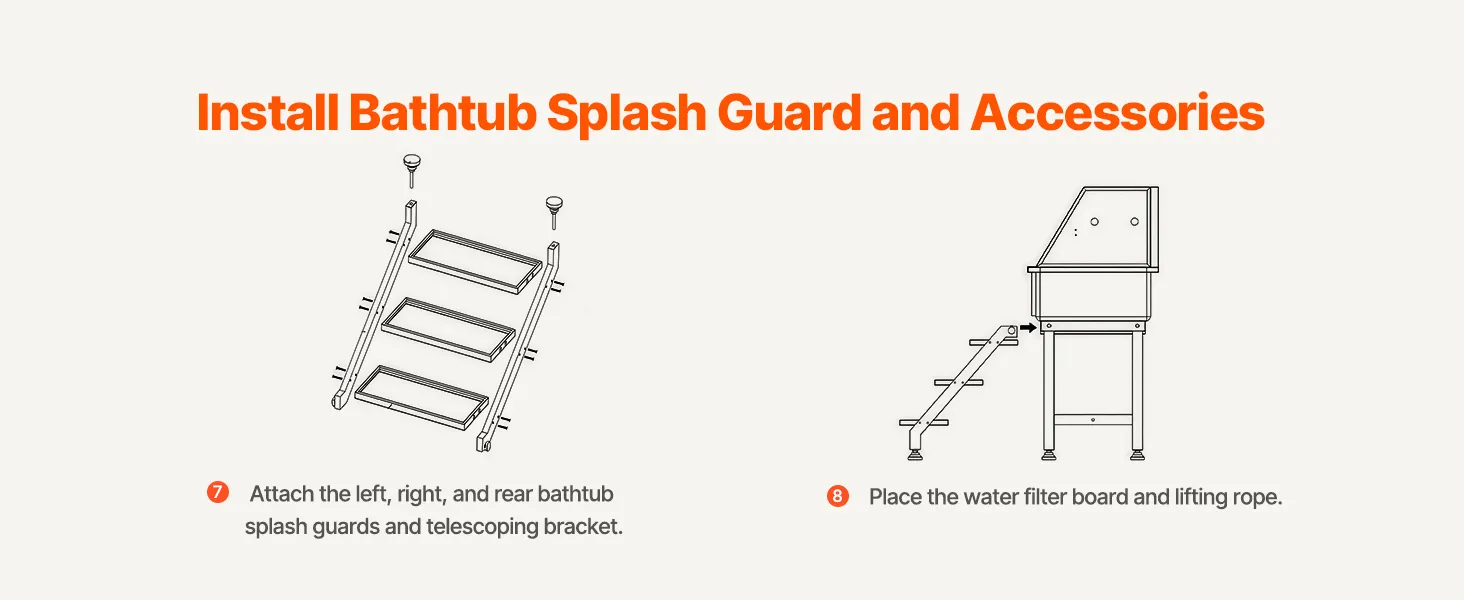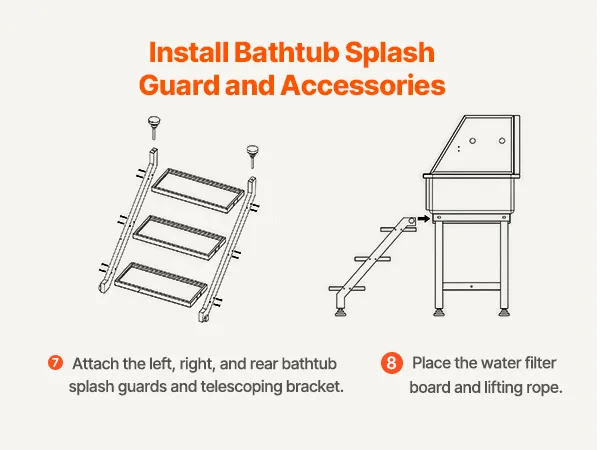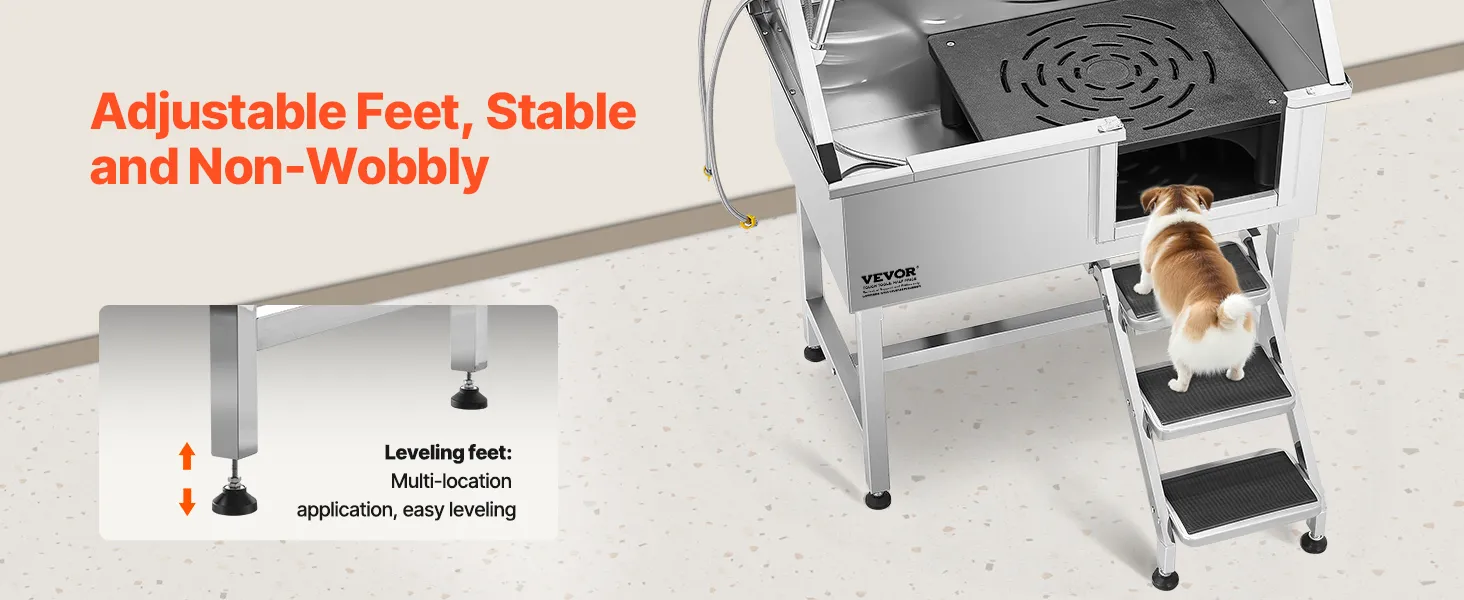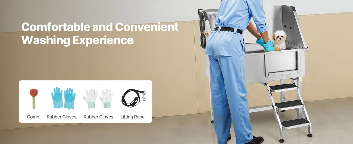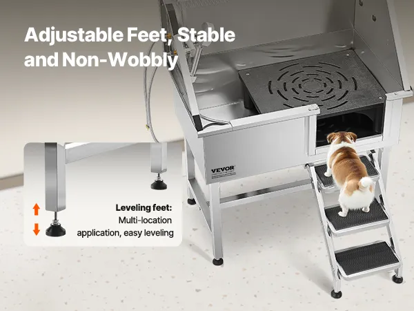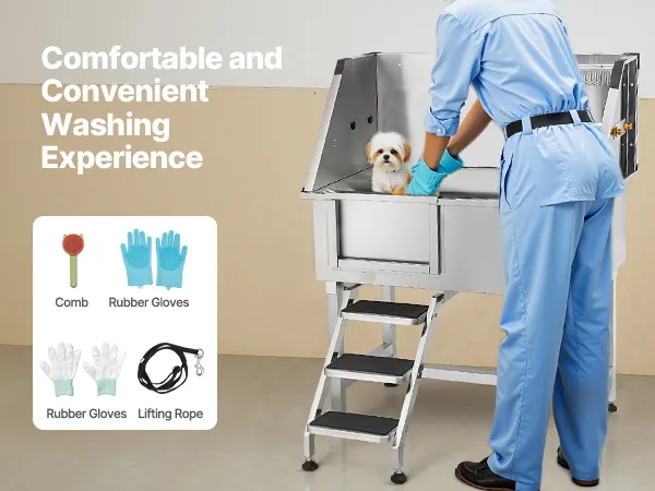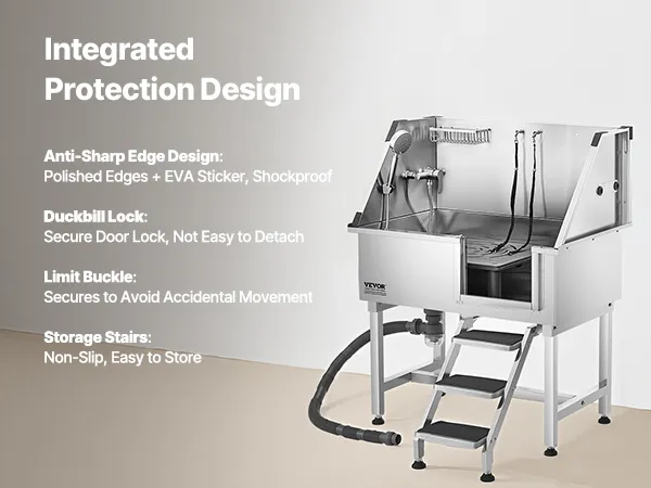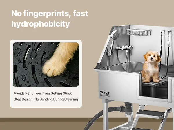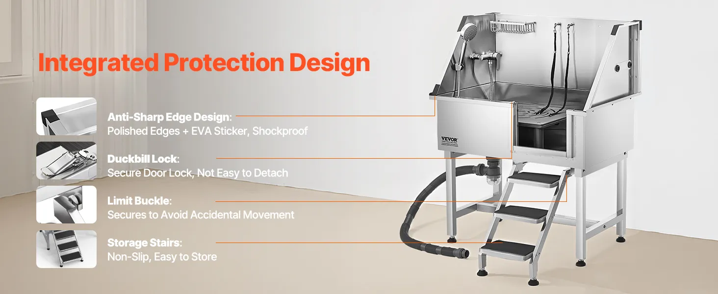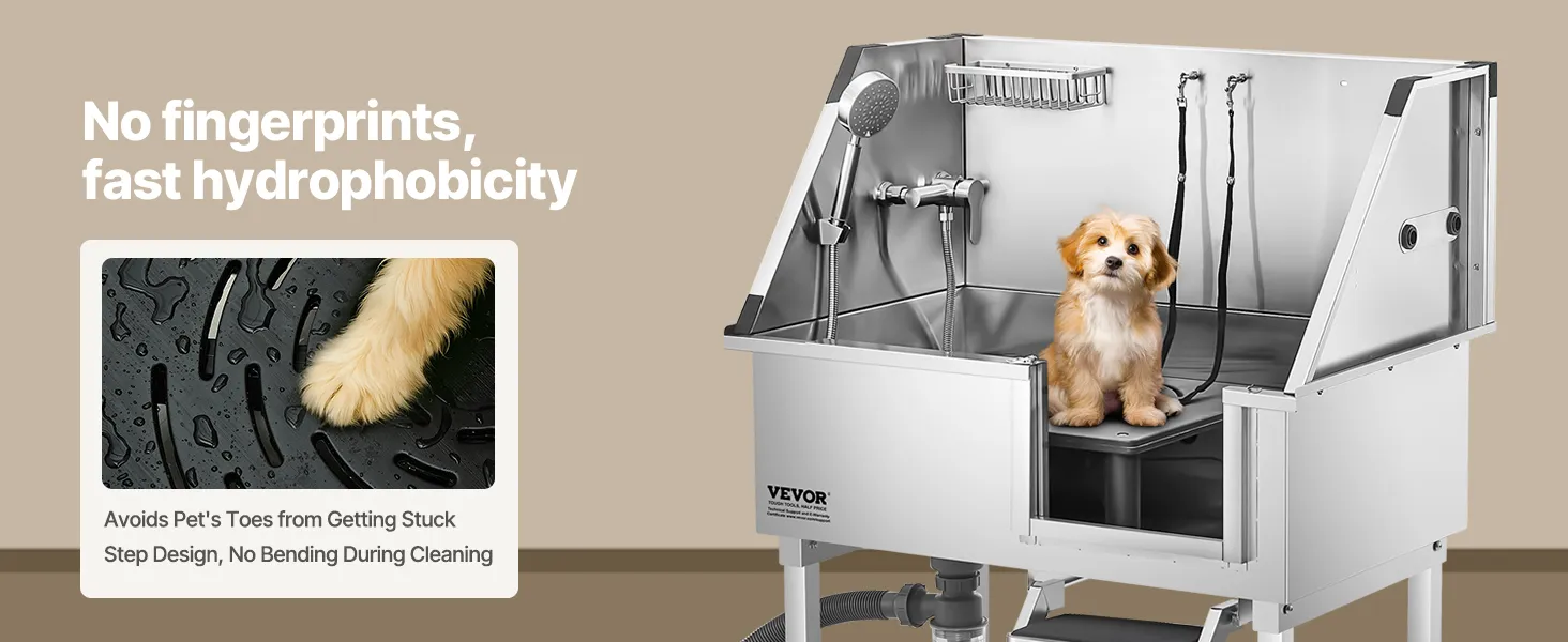 This tub ensures no water leakage. Made from stainless steel, it is corrosion-resistant and sturdy, maintaining its new look over time. The tub features smooth edges, ensuring security for both pets and users during bathing.