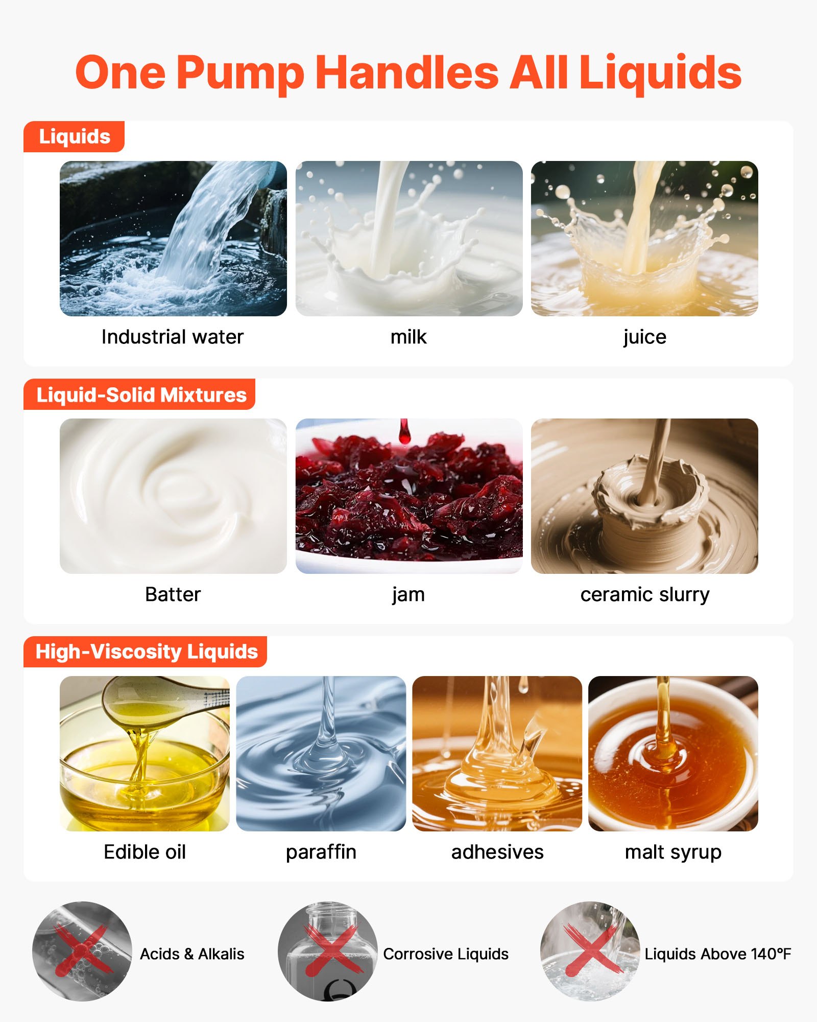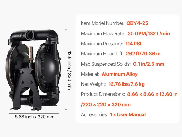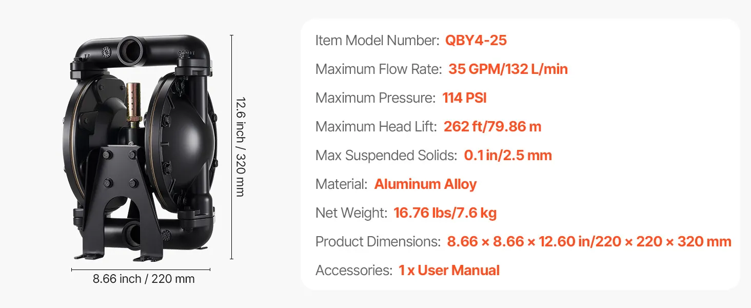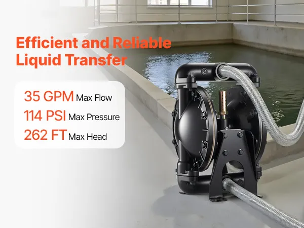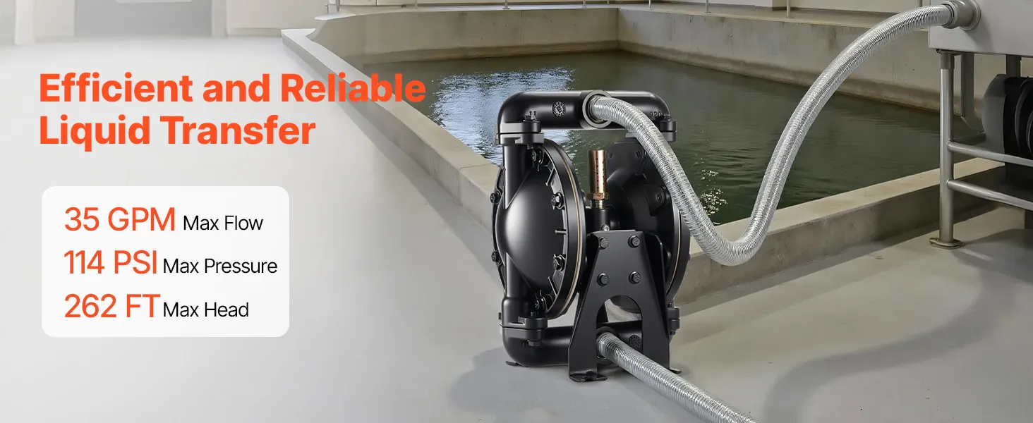Featuring triple-layer rubber diaphragms and a fully bolted structure for a secure seal and long-lasting reliability. With a 35 GPM max flow rate, 262 ft max head lift, and standard port size, it efficiently transfers waste oil, not suitable for corrosive acids/alkalis or liquids above 140℉/60℃.