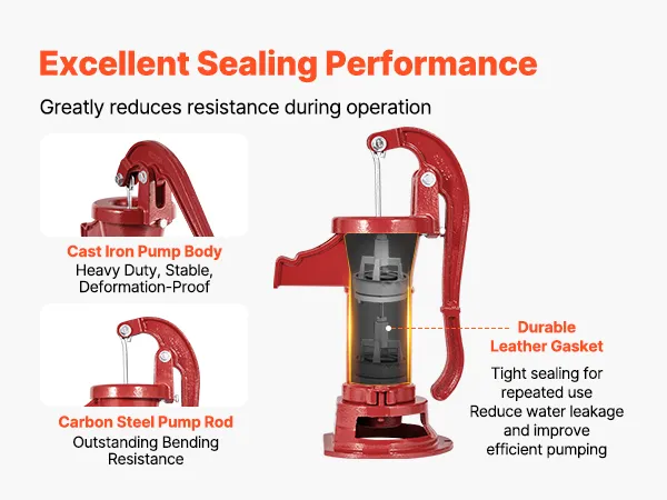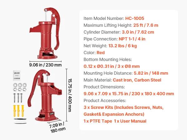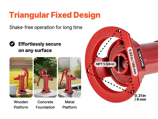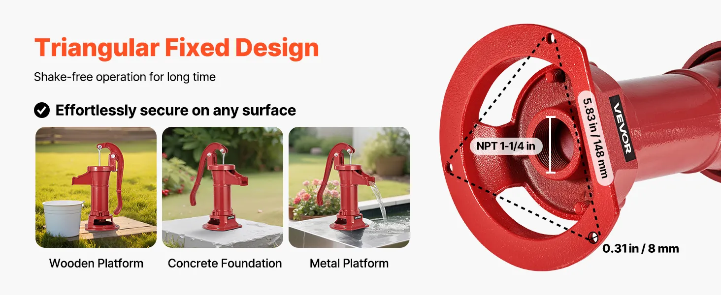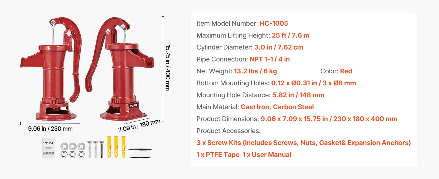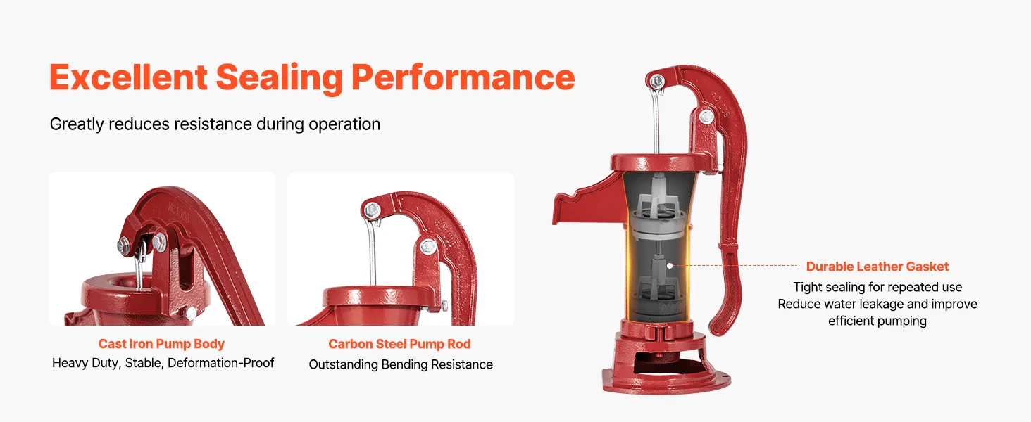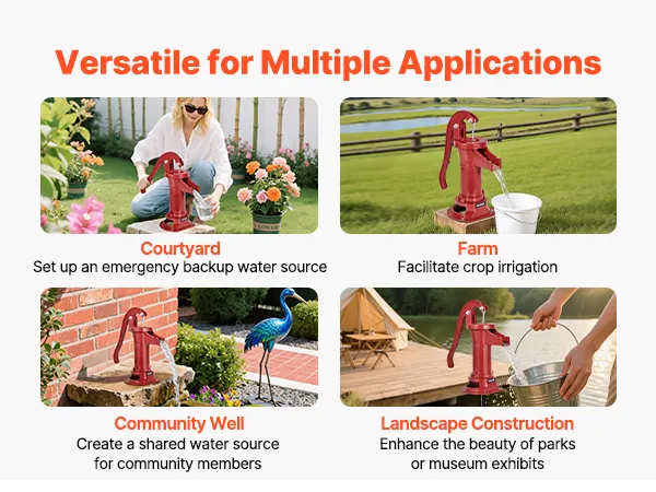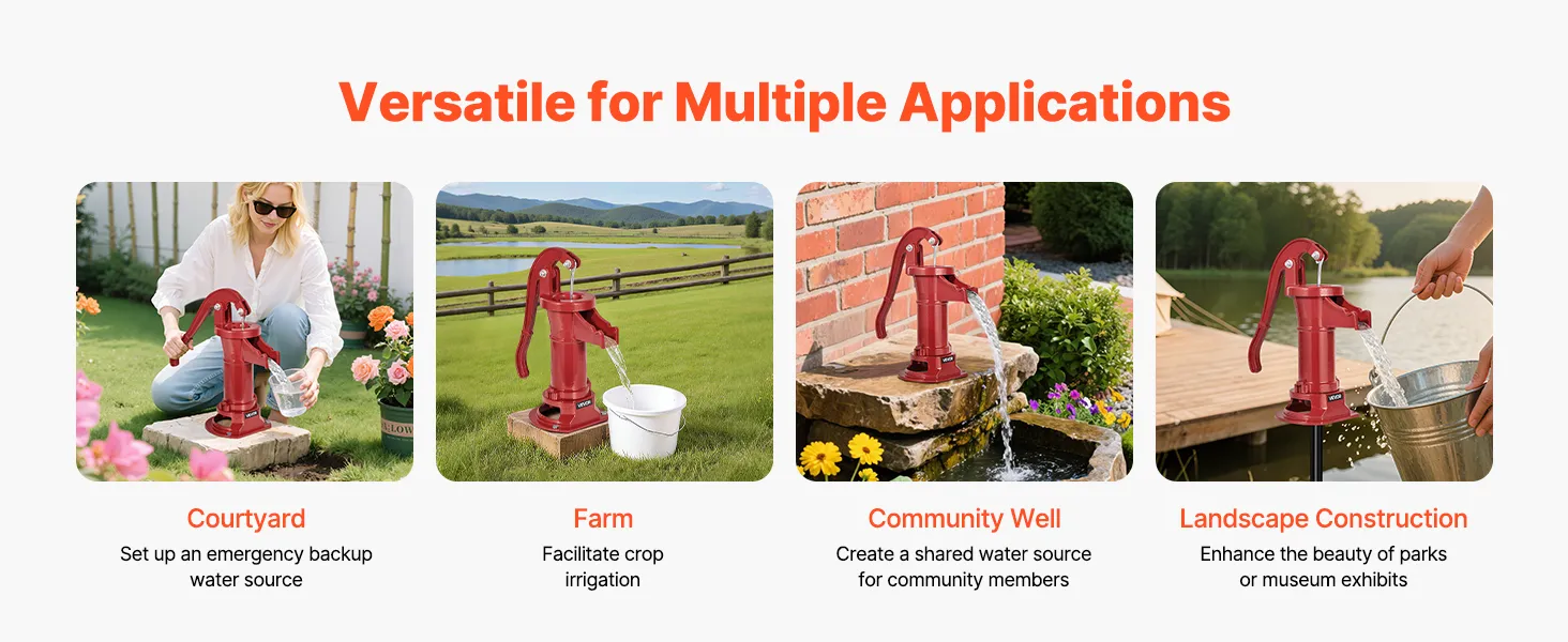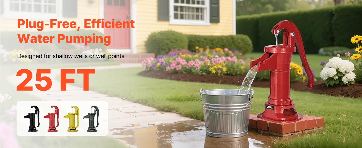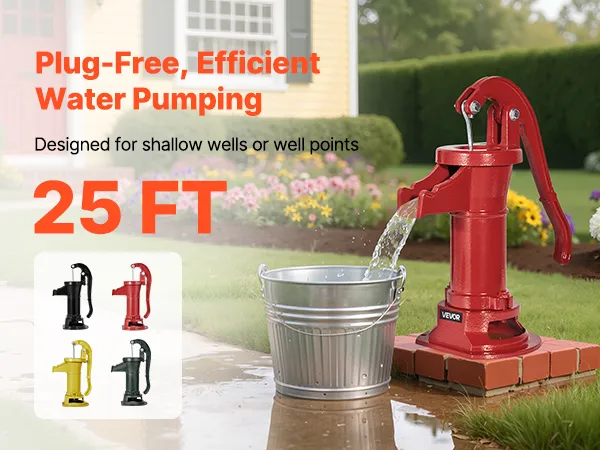 • Efficient Water Pumping: Designed for shallow wells or well points, this hand water pump cast iron lifts water from depths up to 25 ft. Fit for most groundwater levels. No electricity required, just install and start pumping