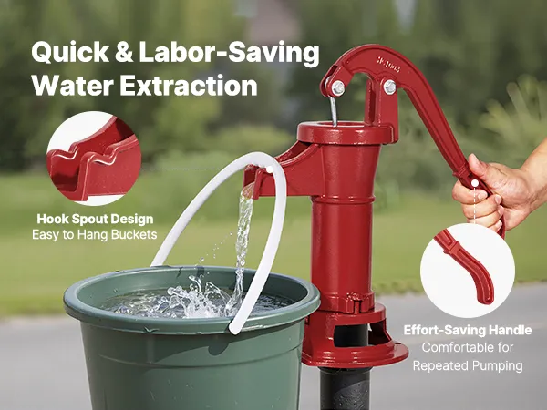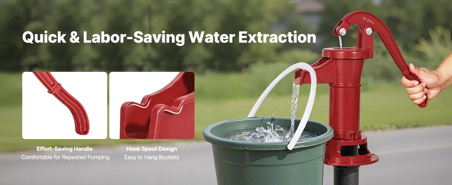 • Effort-Saving Handle: Built to fit the palm’s curve, this pitcher pump for well comes with a labor-saving handle, making pump smooth and strain-free, even after repeated use. Plus, the hook spout design lets you hang a bucket securely without splashes
