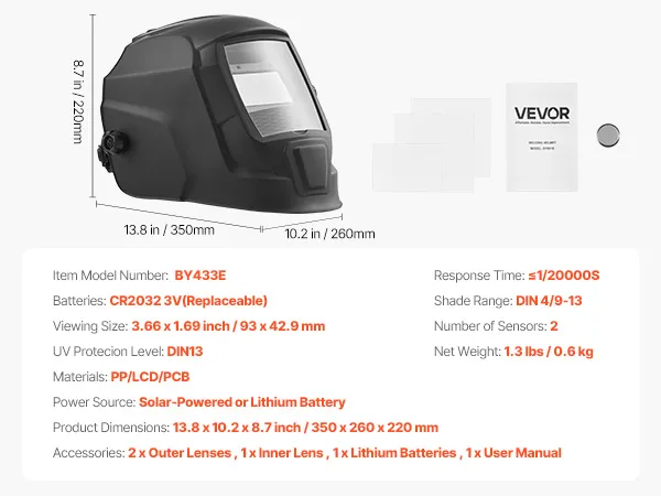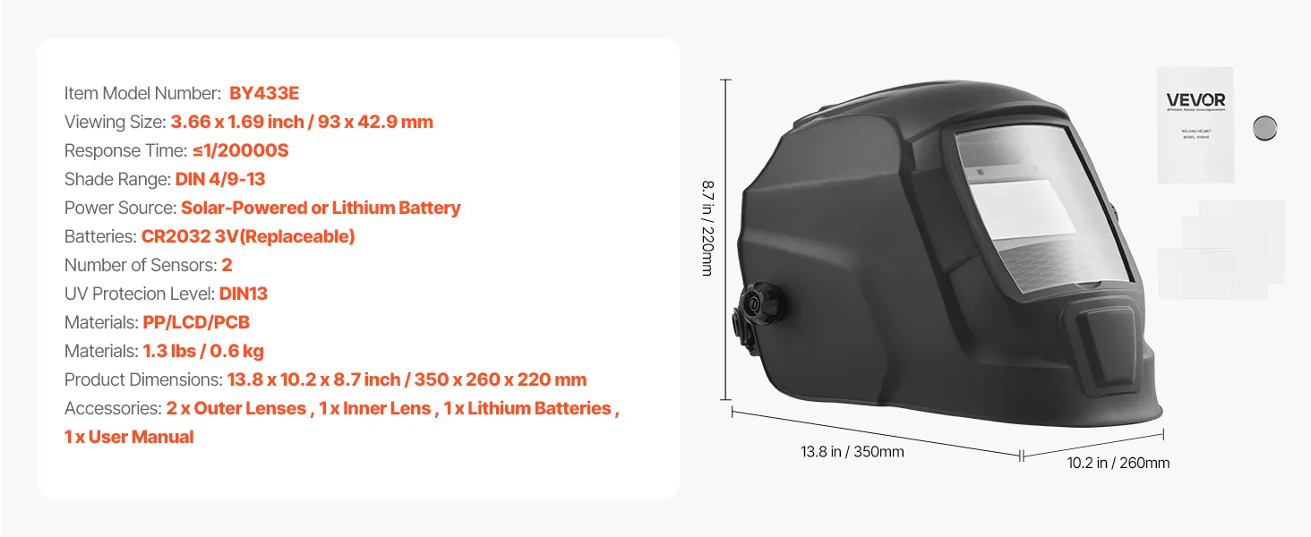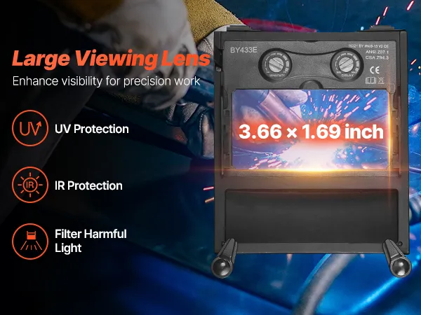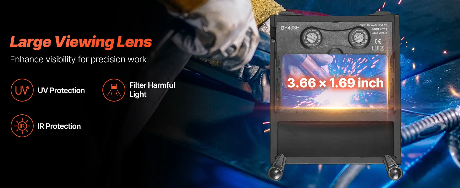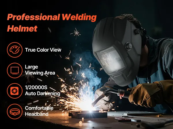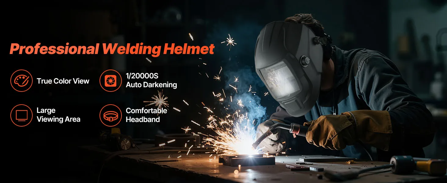 VEVOR auto-darkening welding helmet features a wide shade range of DIN 4/9-13, true color tech, and 2 arc sensors, providing a clearer and more natural viewing experience. It effectively filters harmful light, reduces eye fatigue, and ensures safer grinding and welding operations.