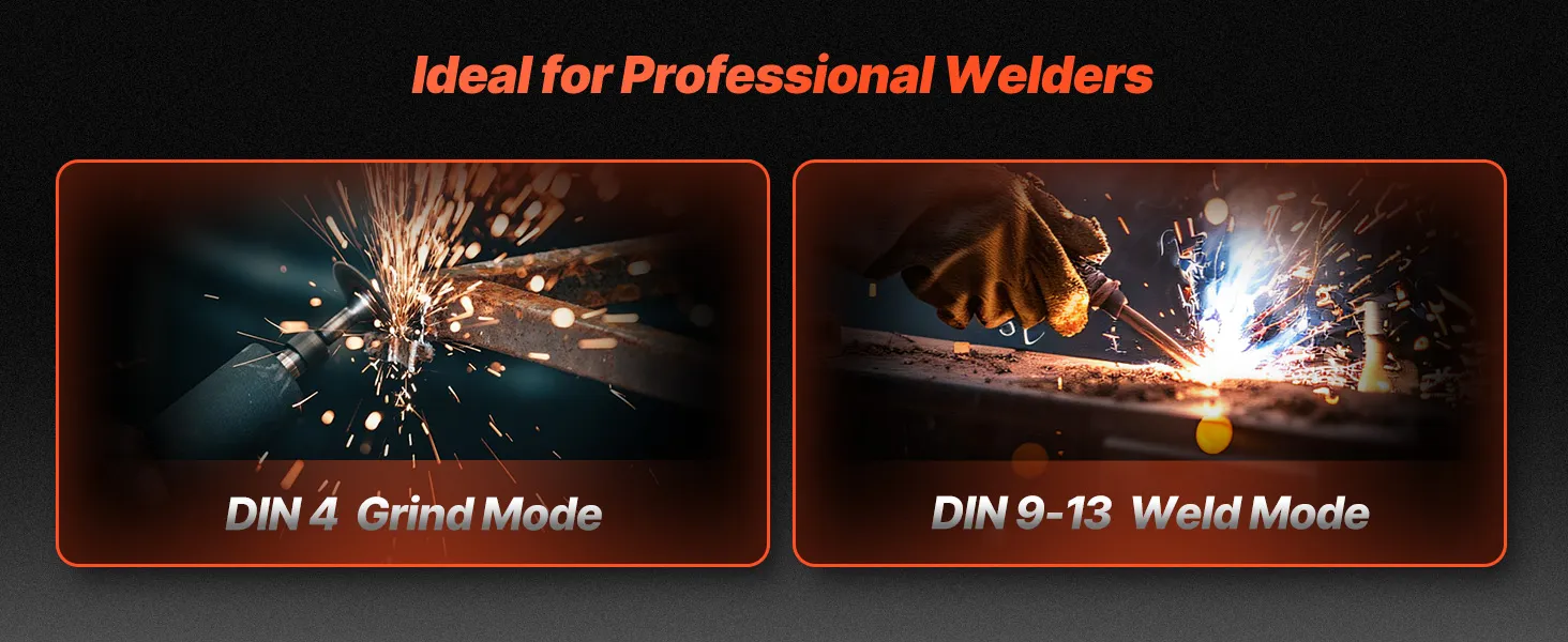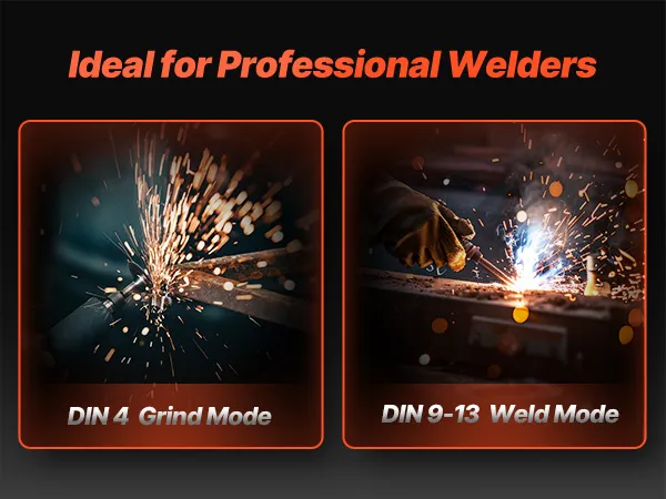 Equipped with adjustable DIN shade levels—DIN 4 (Grind Mode) and DIN 9–13 (Weld Mode)—this welding helmet lets you easily switch modes to suit different tasks, enhancing working efficiency and safety.