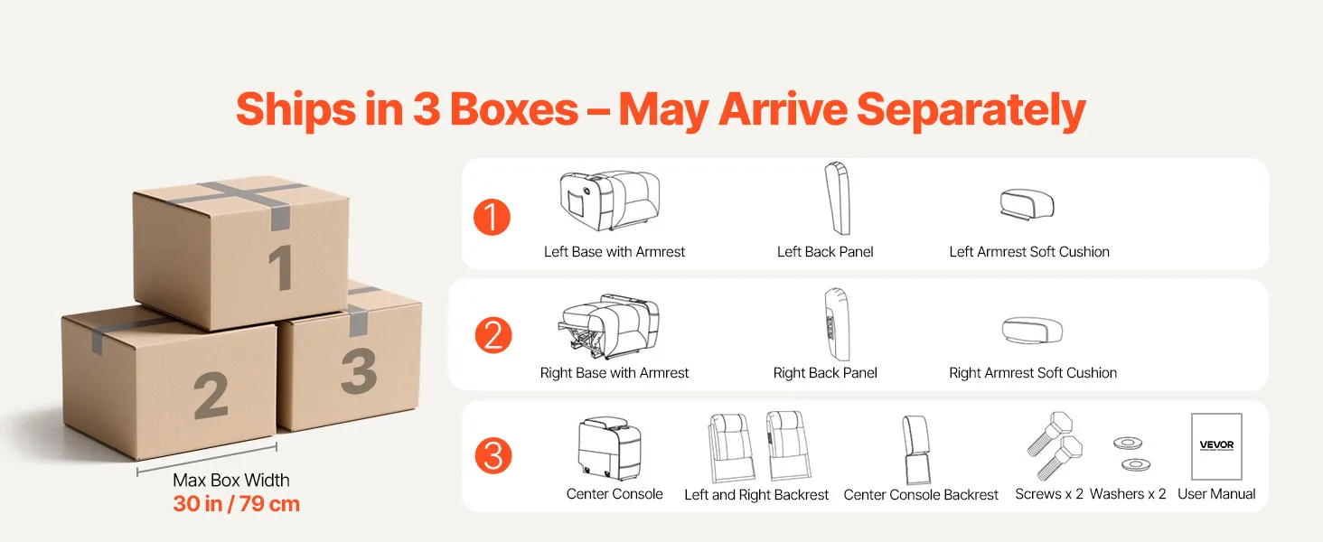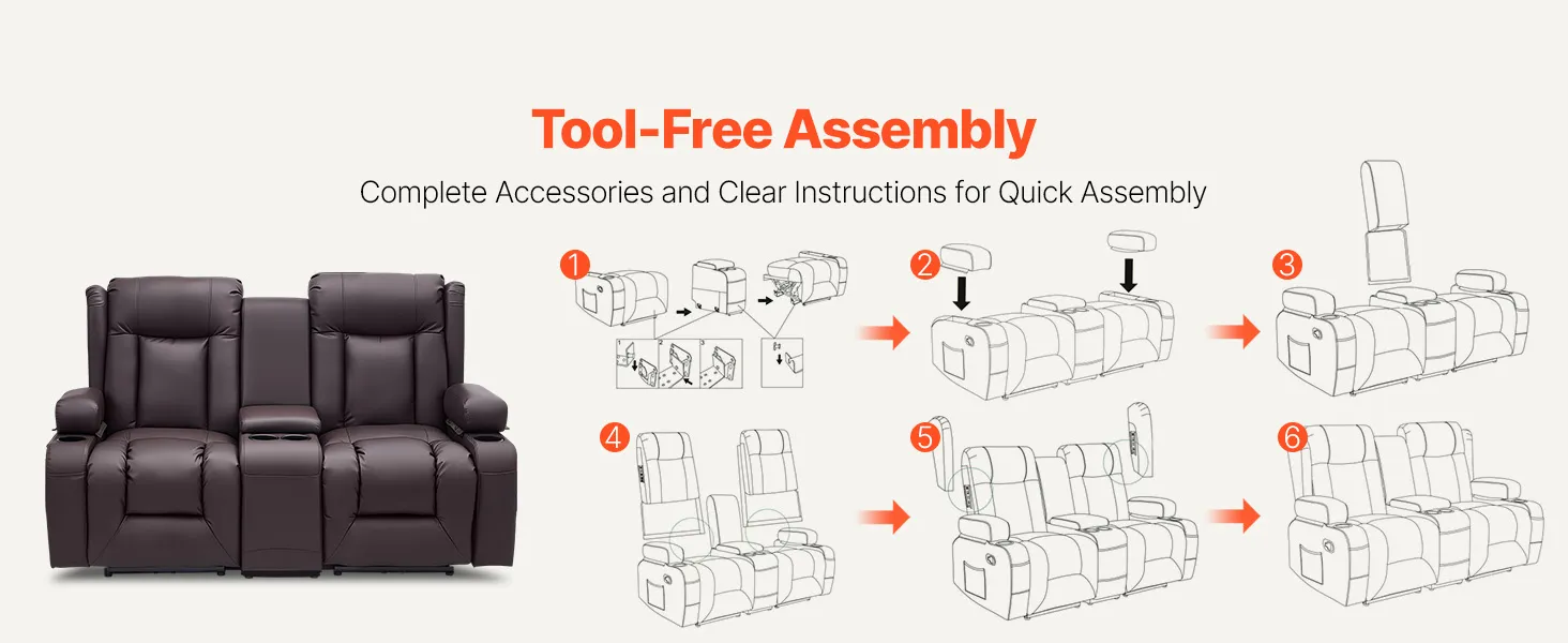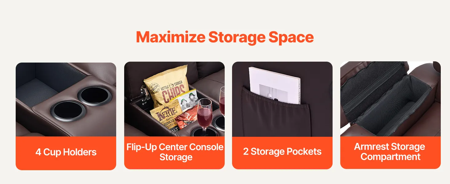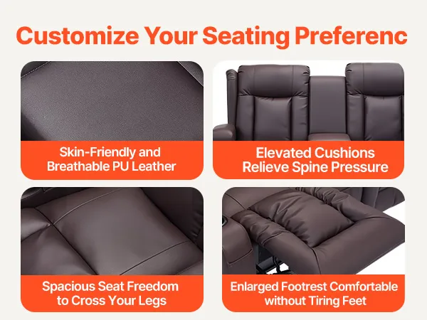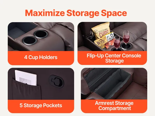 VEVOR Loveseat Recliner Sofa, Manual Reclining Couch with Center Console, PU Faux Leather Recliner Sofa with USB Ports, Cup Holders and Storage Bags, Dual Loveseat Chair for Living Room/RV, Brown
