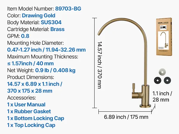 VEVOR Stainless Steel Faucet, Lead-Free Water Purifier Faucet, Filter Water Faucets With Solid Brass Valve, Anti-Rust & Durability Ro Water Faucets For Kitchen, Bar Counter, Cafe Shop, Brushed Gold