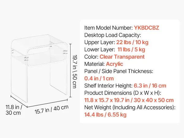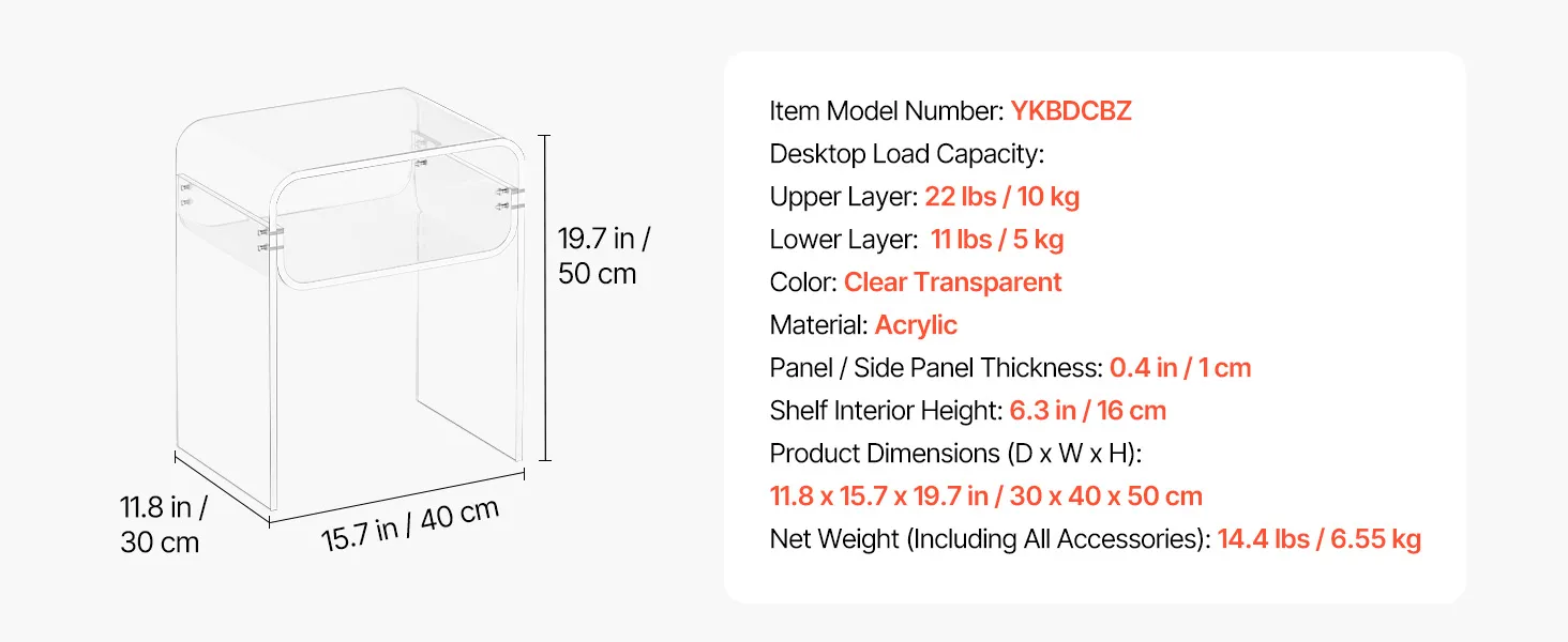VEVOR прозорий акриловий приліжковий стіл, 2-рівневий столик з полицею, 30x40x50 см, сучасний стіл для спальні/вітальні