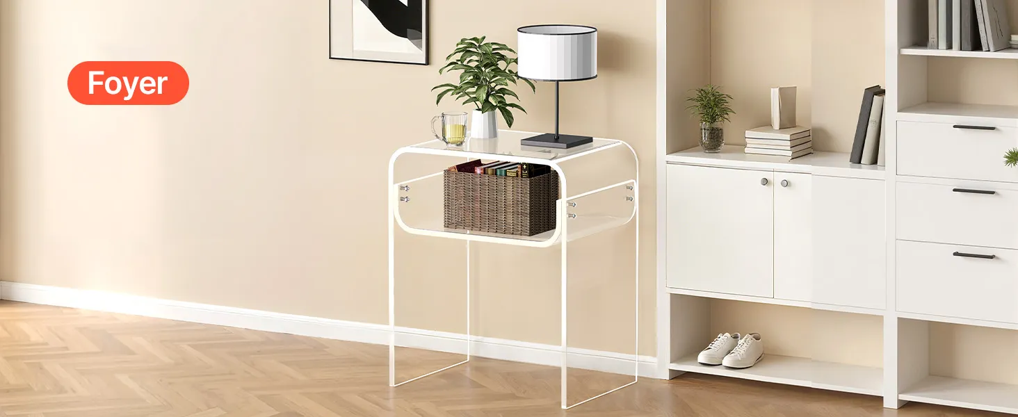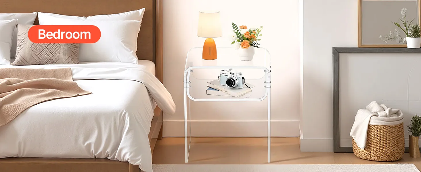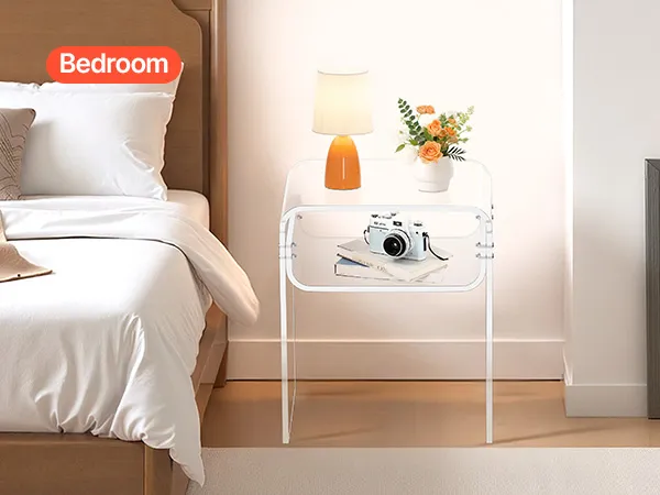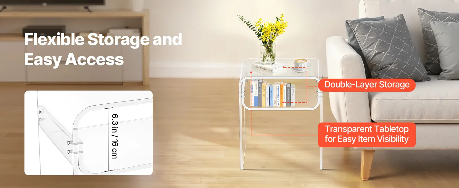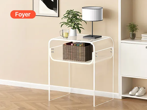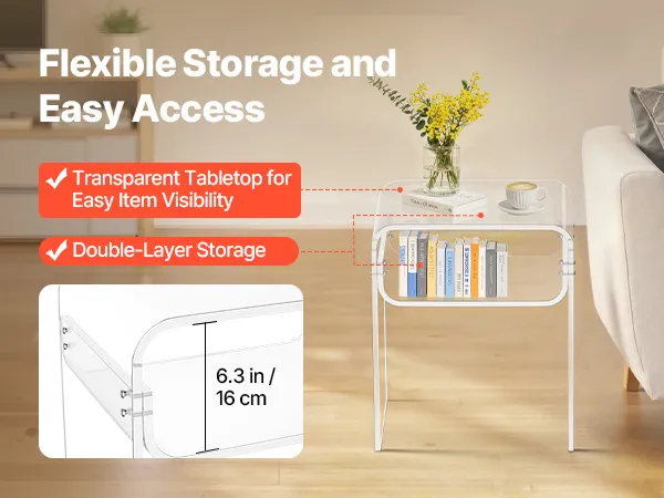 • Dual Storage Space: This acrylic desk features spacious 2-tier storage for small items and decor pieces. The transparent tabletop provides an unobstructed view, making it easy to find what you need—ideal as a side table, small coffee table, or nightstand