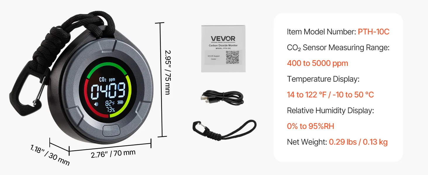 VEVOR Carbon Dioxide Monitor, CO2 Controller with Temperature and Humidity Display, NDIR Sensor Carbon Dioxide Detector, for Outdoors, Home, Office, Car, Lightweight & Portable