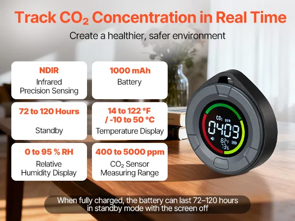 Monitor CO₂ levels effortlessly with our carbon dioxide monitor. High-accuracy infrared sensing ensures stable readings across different concentrations. With long-lasting battery power of 72-120 hours on standby and intuitive operation, it is ideal for outdoor spaces, offices, classrooms, and labs.