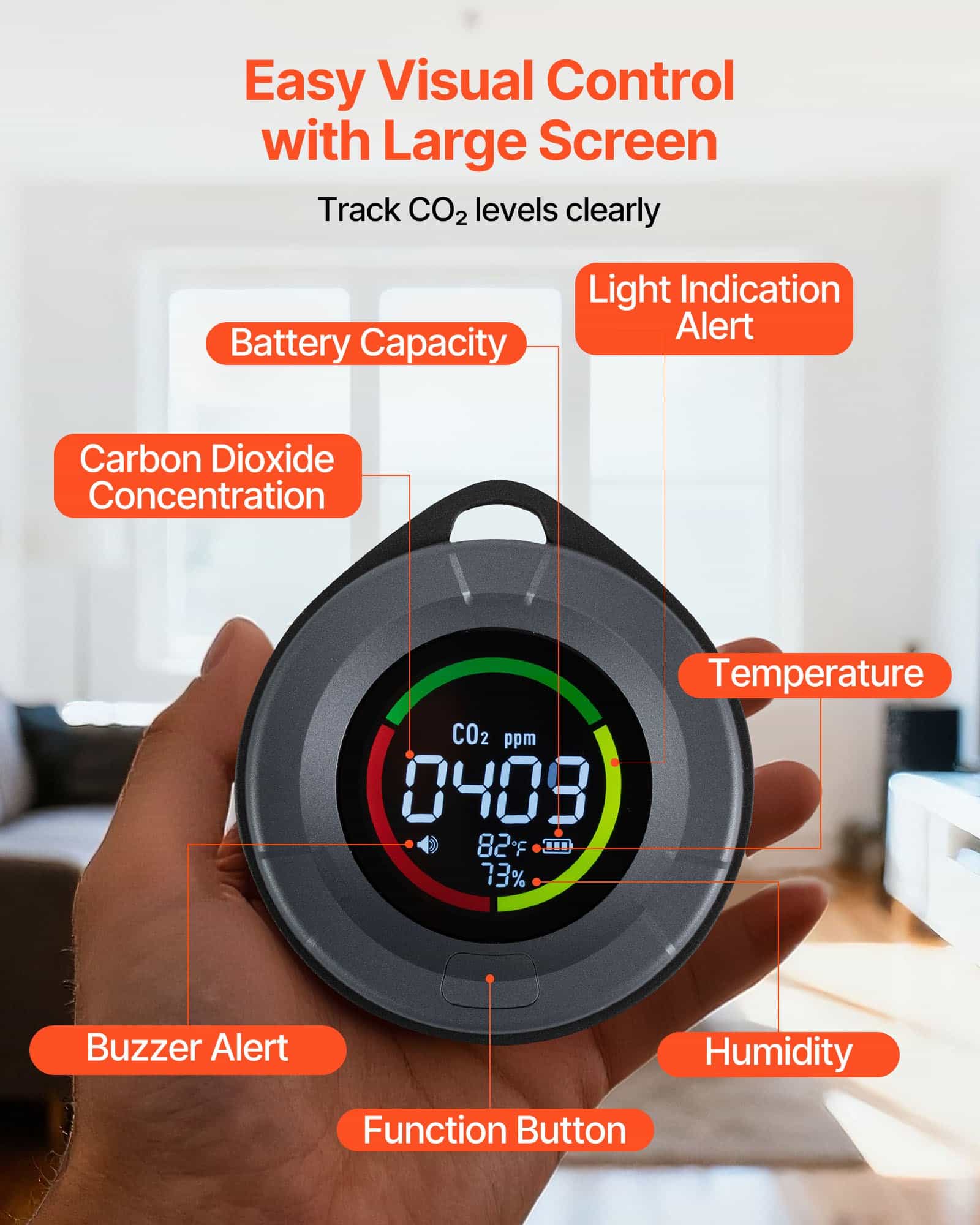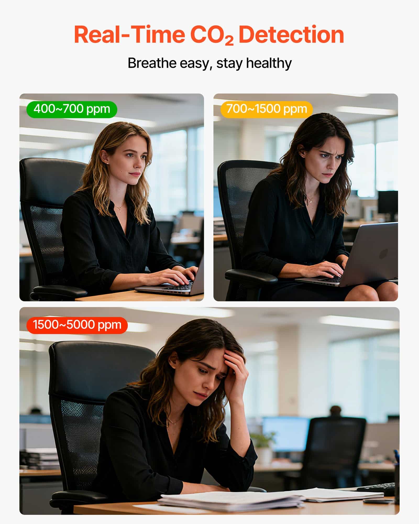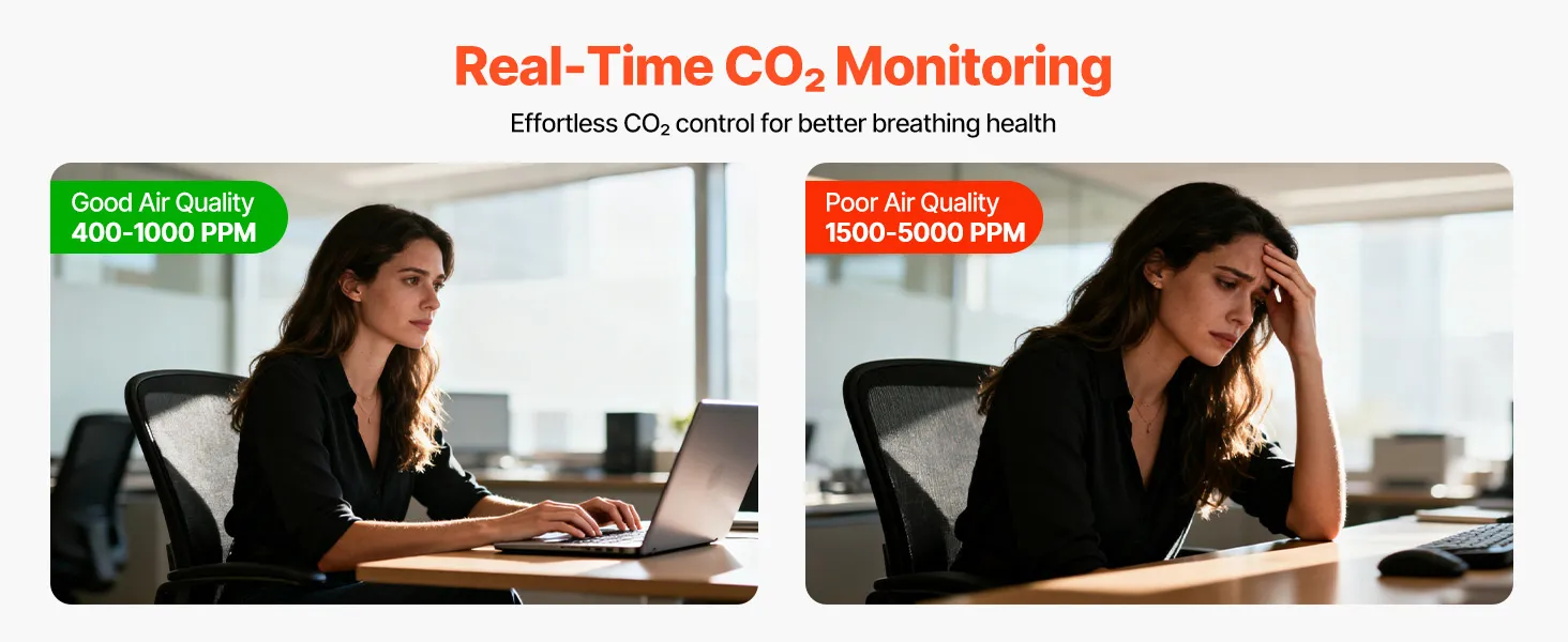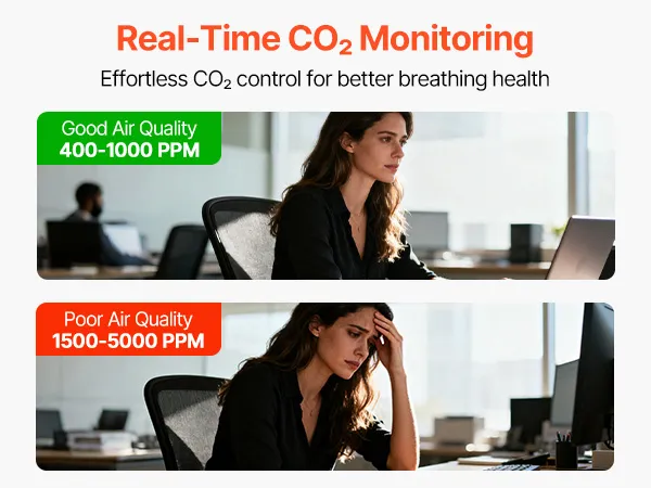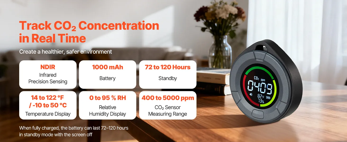 This VEVOR CO2 monitor features a three-color backlight system: green (400-700ppm), yellow (700-1500ppm), and red (1500-5000ppm), providing real-time air quality feedback. Instantly alerting users to CO₂ levels, it helps adjust ventilation and supports more comfortable indoor breathing.