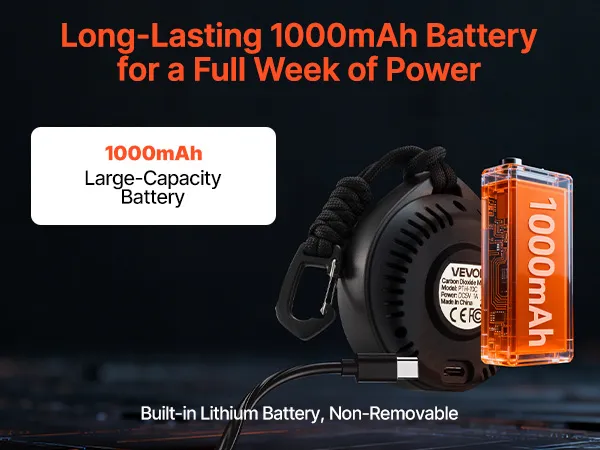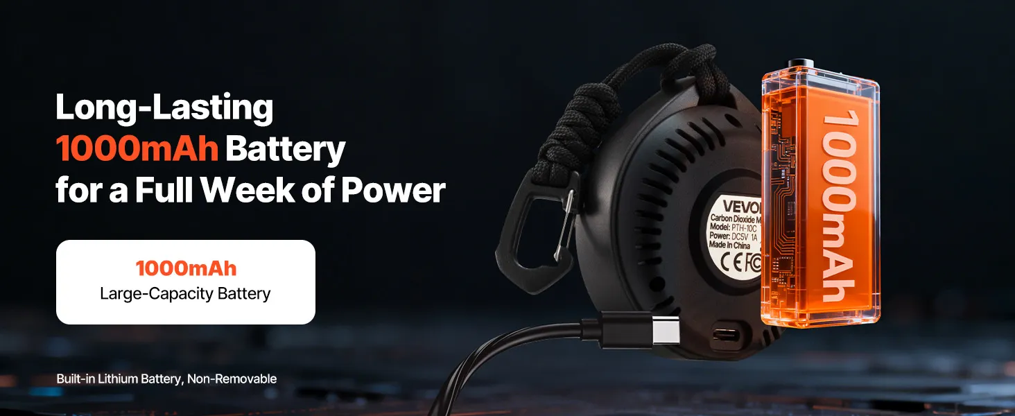 Designed for long-term use, this CO2 sensor features a 1000mAh battery that provides 72 to 120 hours of continuous operation. Ideal for portable or outdoor monitoring, it ensures reliable CO₂ readings in classrooms, offices, greenhouses, and other spaces.