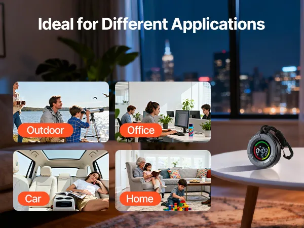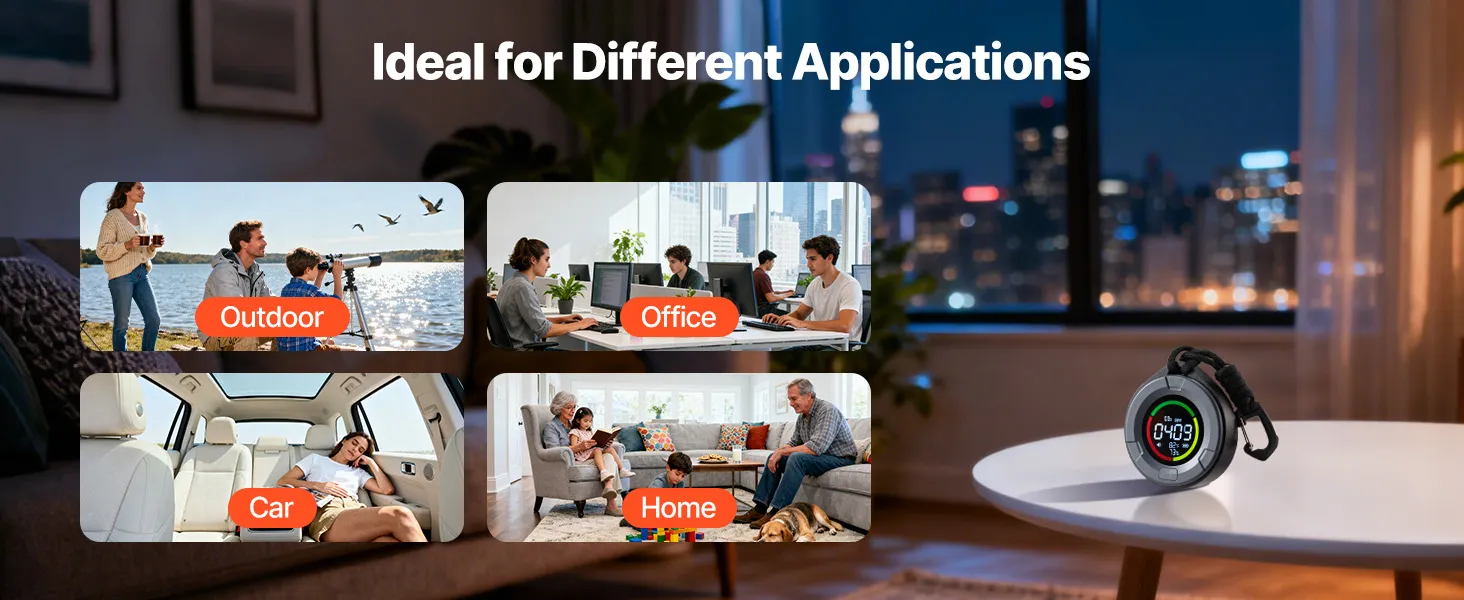 This carbon dioxide meter is designed for multiple environments, including outdoors, offices, cars, and homes. It adapts to different spaces and user groups, providing reliable CO₂ monitoring for various scenarios while offering convenient and consistent indoor and mobile air management.