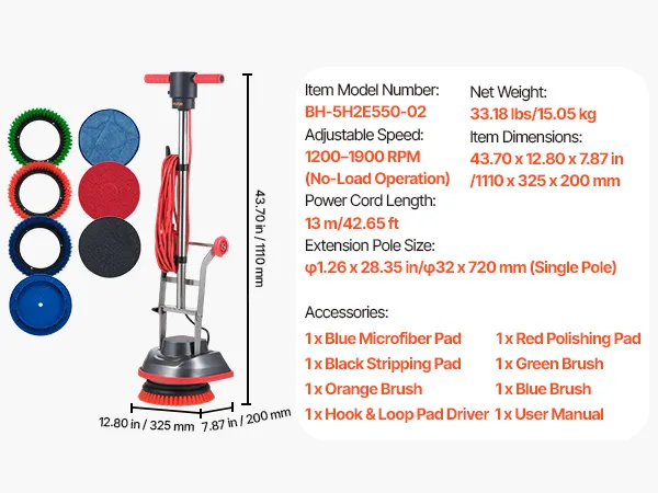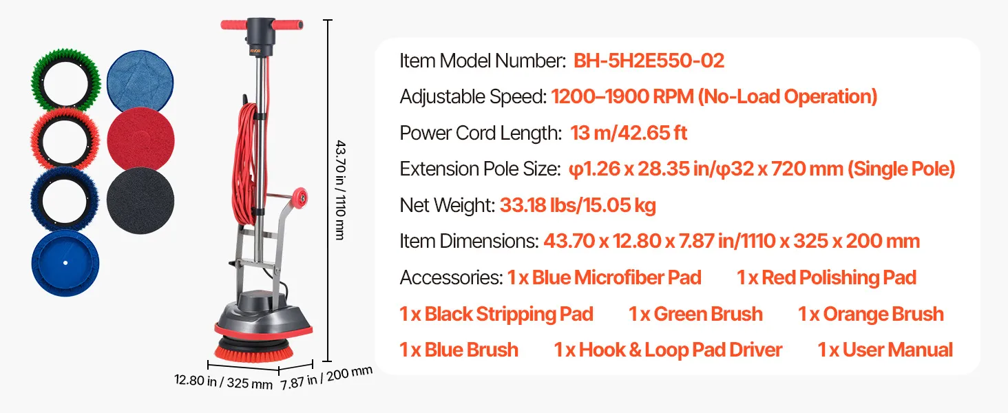 VEVOR Commercial Floor Scrubber Machine, Heavy Duty Floor Cleaner Polisher with 2 Wheels, Professional Electric Carpet Buffer, Max 1900 RPM, 43 FT Cord, 3 Pads & 3 Brushes - All Floor Surfaces