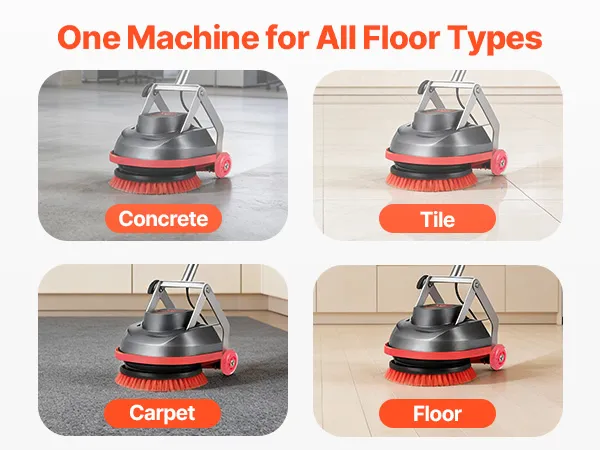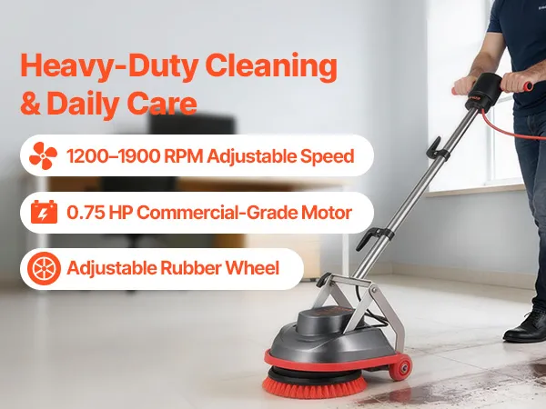 Our floor scrubber machine is powered by a 0.75HP commercial motor with adjustable speed up to 2000 rpm, delivering strong stain removal while staying gentle on delicate floors.
