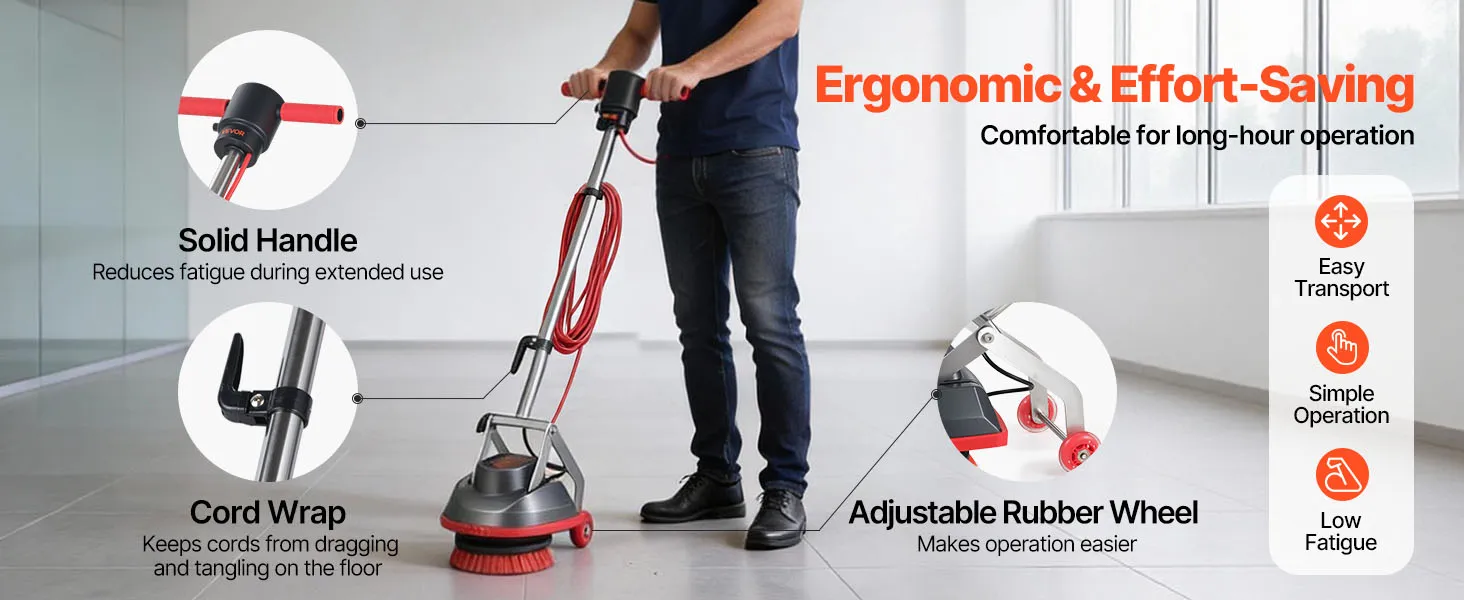 With an optimized body, grip, and flexible wheels, this floor cleaner polisher ensures stable and effortless operation over extended periods, effectively reducing fatigue.