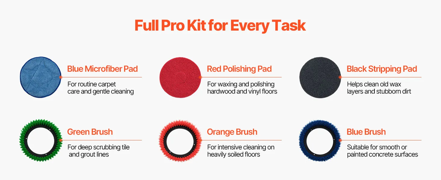 Our floor scrubber comes with a complete set of professional brush heads and pads, ready for everything from daily cleaning to deep cleaning.