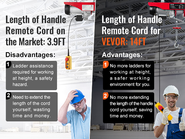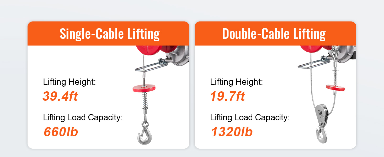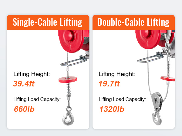 • 1320 lbs Load Capacity: This garage lifting machine can easily lift small engines, transmissions, large workshop tools, or construction supplies. Capacity: 660 lbs (Single Line), 1320 lbs (Double Lines).