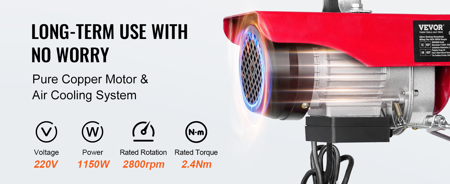 • Powerful Motor: The high-quality copper motor provides 1150W of strong power, which can withstand large forces without causing deformation of the electric winch. In addition, the large cooling fan can quickly cool the machine to avoid overheating. Therefore, this powerful motor ensures efficient operation and saves you more time and energy.