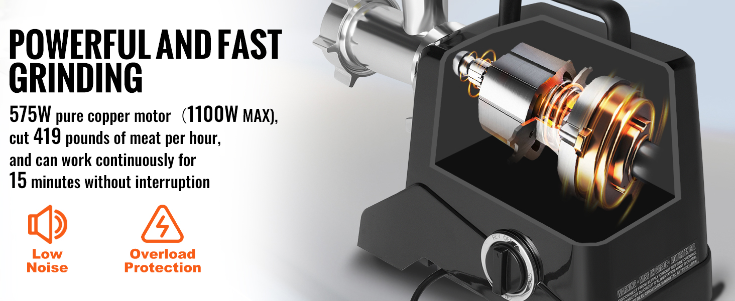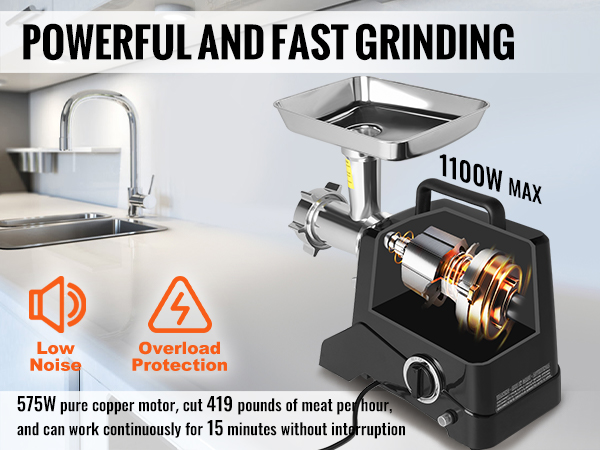 This meat grinder has a peak output of 1100 watts and a rated power of 575. It can grind up to 419 pounds of meat per hour! Works continuously for over 15 minutes. It is a reliable helper for making ground meat quickly and efficiently at home!