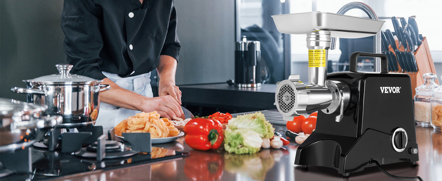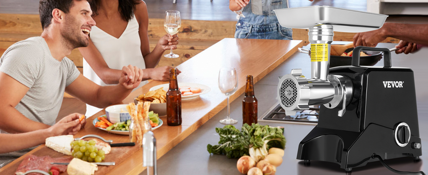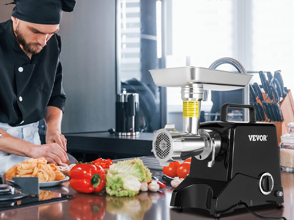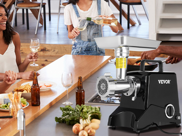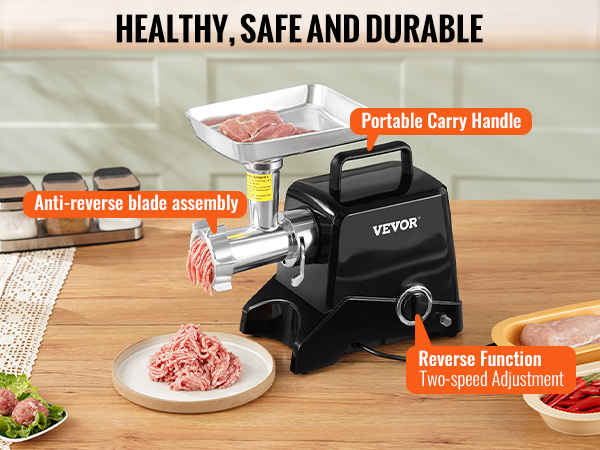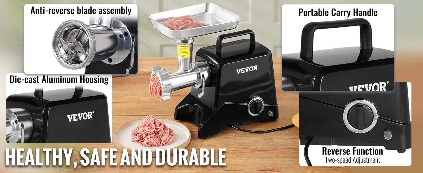 This meat grinder is equipped with power up to 575W (1100W Max) and can grind various meat: beef, chicken, turkey, bison, venison, etc. Or use the sausage accessories to make delicious homemade sausages. The die-cast aluminum housing is durable, and the reverse function helps avoid jamming.