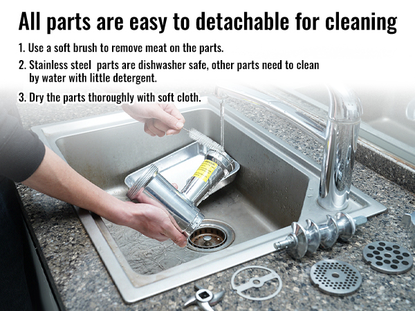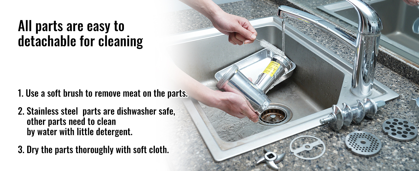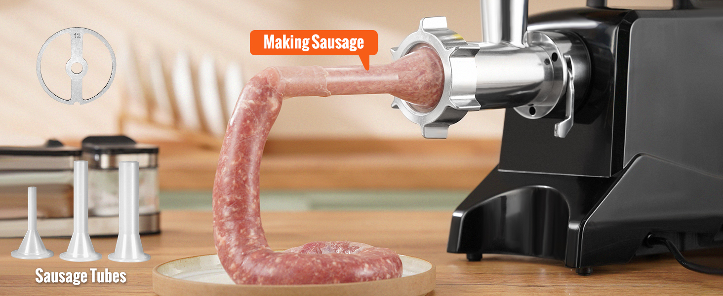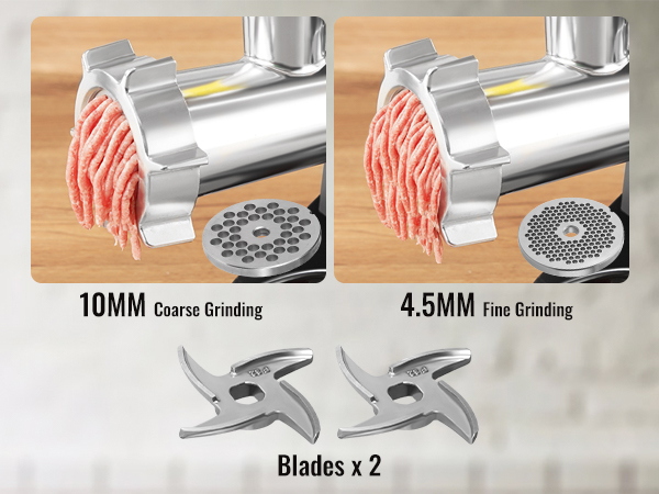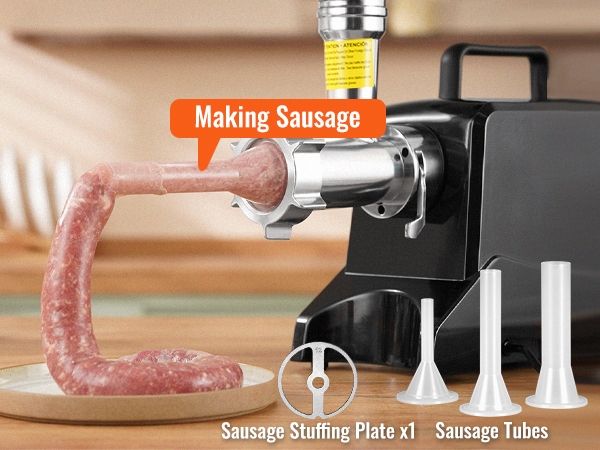 Besides making ground meat, you can also use it to make different kinds of sausages. Include 2 stainless steel cutting plates for coarse and fine meat grinding, 3 sizes of sausage stuffing tubes along with the plate, and one cleaning brush.