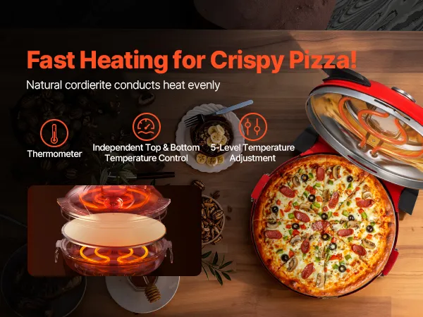 Our electric pizza maker features a precise temperature control system with a natural cordierite pizza stone. It can efficiently store heat and evenly transfer heat to form a crispy pizza base, creating a crisp crust that captures the delicious pizza texture.