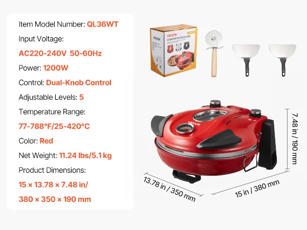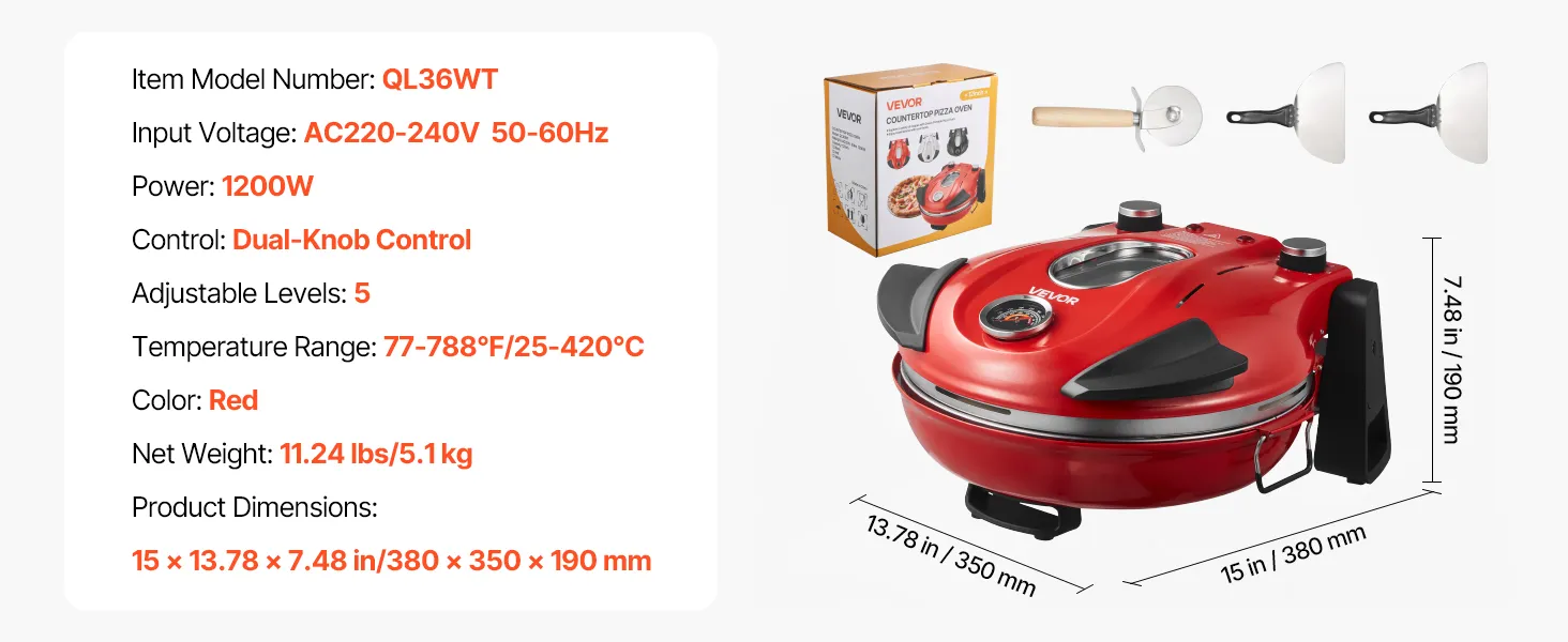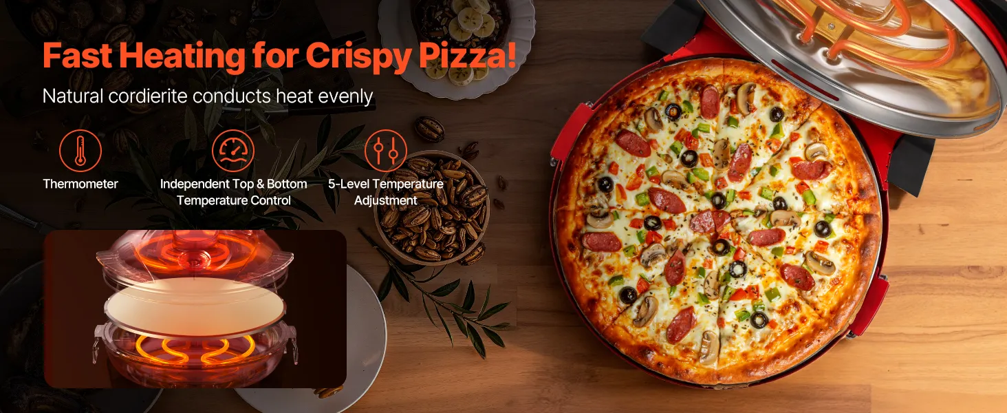 VEVOR Pizza Oven, 304.8 mm Electric Pizza Maker, 1200W Electric Pizzas Cooker with Cordierite Stone, 5-Mode Temperature Control, Viewing Window for Precise Cooking, Heats up to 420℃, for Home (Red)