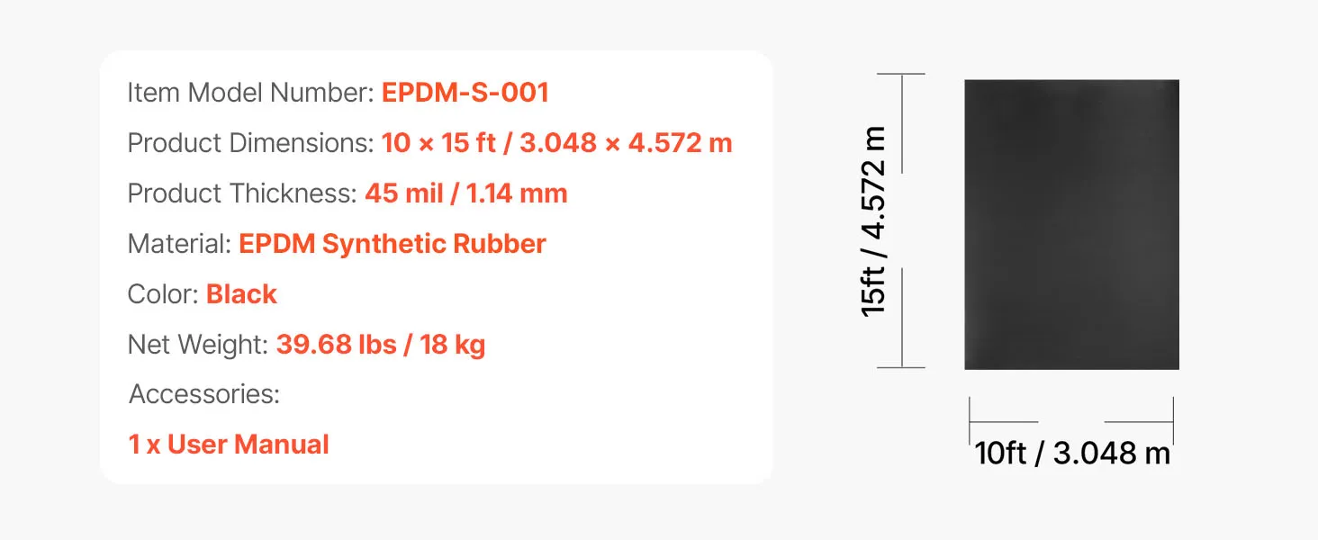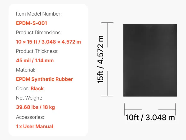 VEVOR Roll Roofing, 10 x 15 ft, 45 mil EPDM Rubber Roofing, Long Lifespan & Weather-resistant, Withstands Harsh Temperatures, Flexible & Easy Installation, Roof Underlayment for RVs, Roofs, Ponds