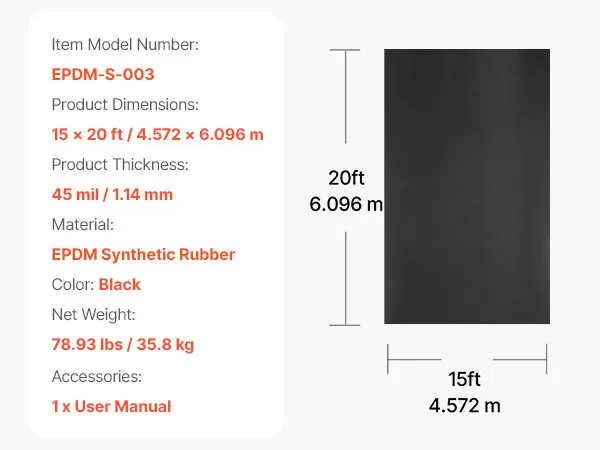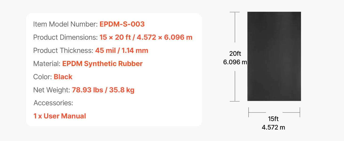 VEVOR EPDM Rubber Roofing Roll 4.57×6.10m, 1.14mm Thick, Waterproof & Weather-Resistant Membrane for Roofs, RVs, Ponds