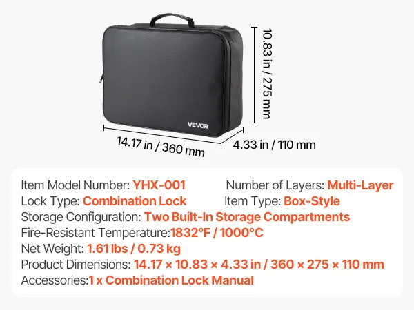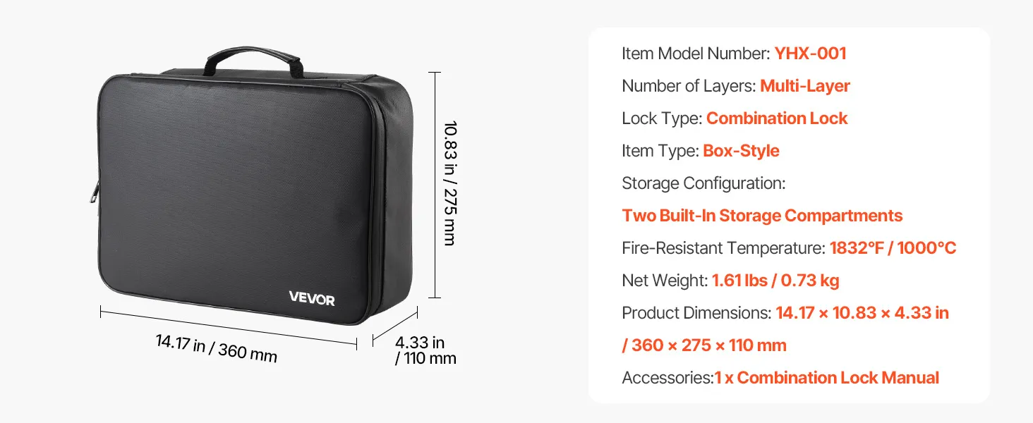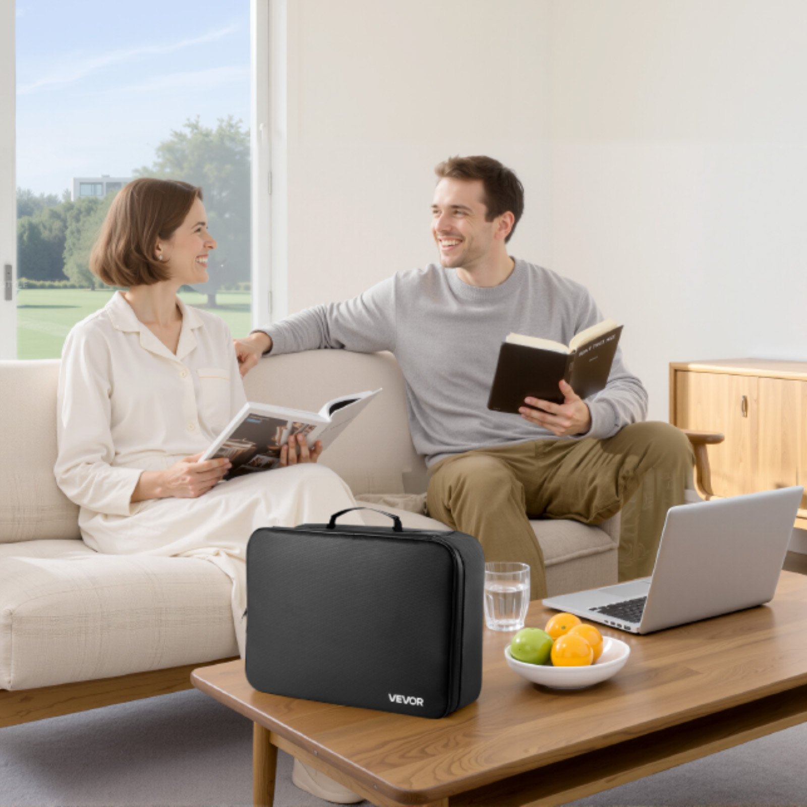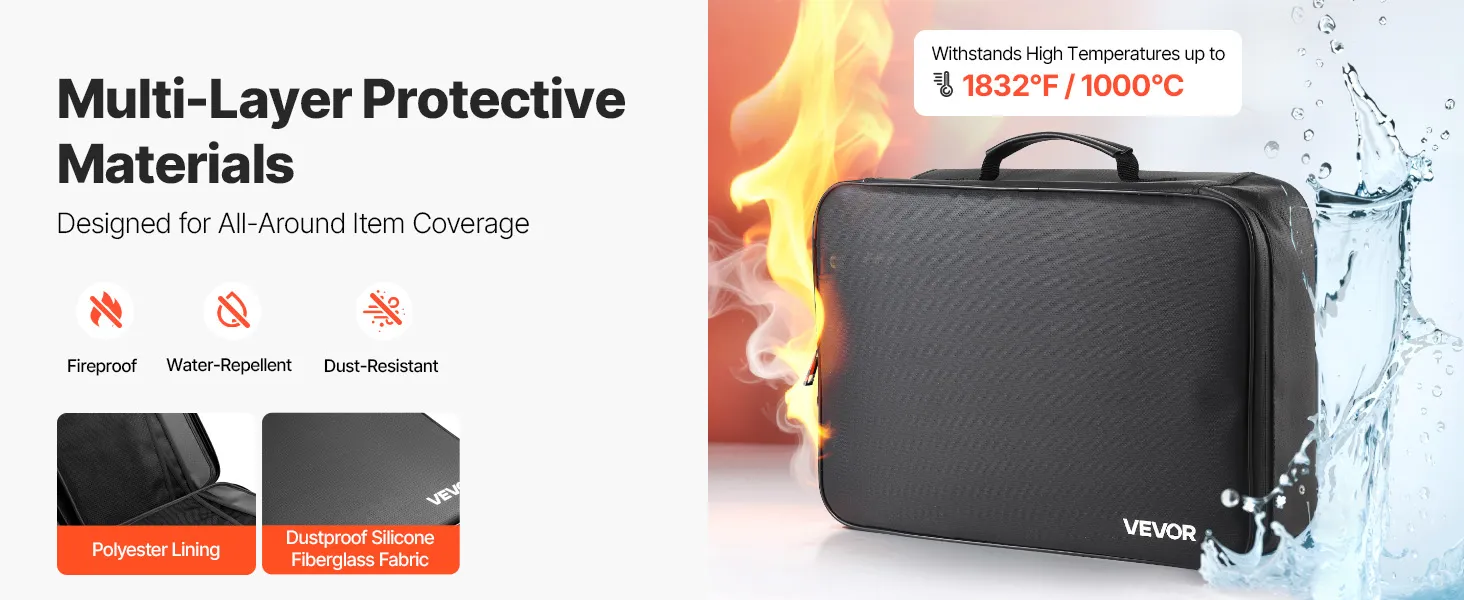 VEVOR Вогнестійка Скринька для Документів із Замком, Водонепроникна та Термостійка до 1000°C, Портативний 2-Шаровий Органайзер