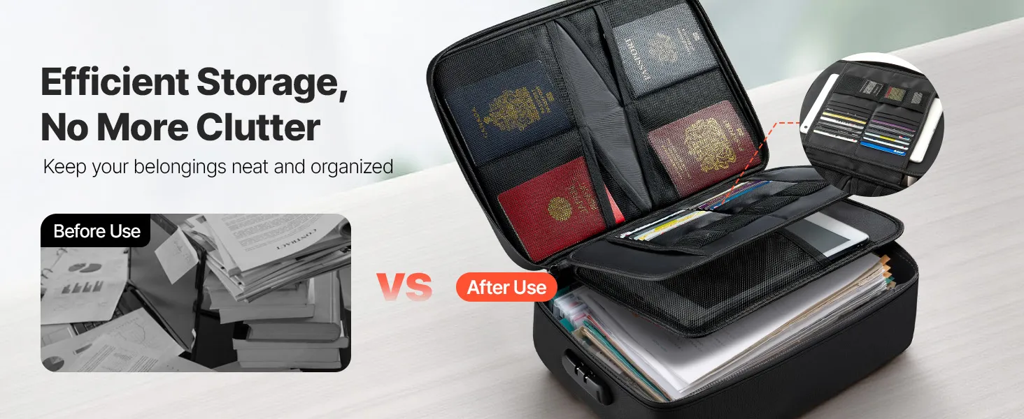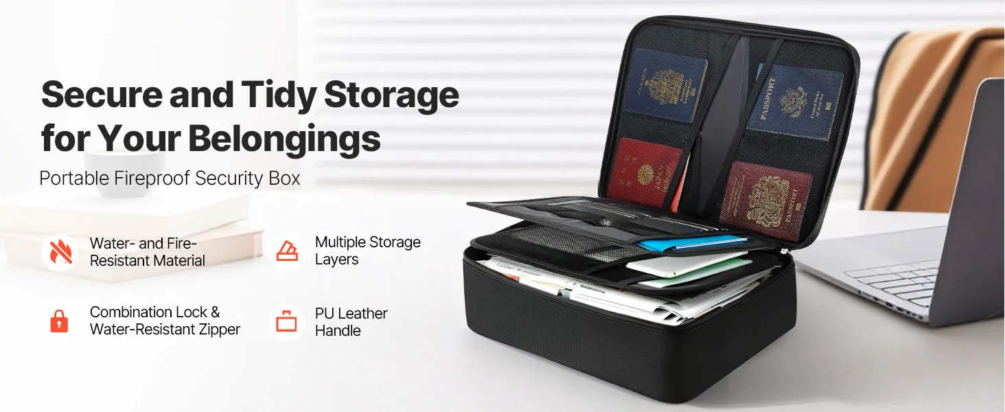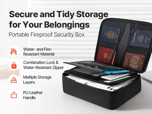 • Dual Security: This fireproof file box features a 3-digit combo lock and waterproof zipper, creating a secure barrier for valuables. The combo lock helps prevent tampering, while the waterproof zipper withstands high-pressure water jets, offering reliable security in emergencies or daily use