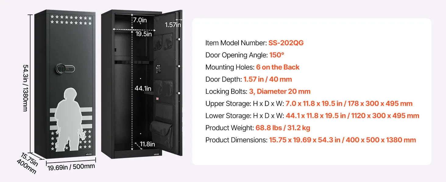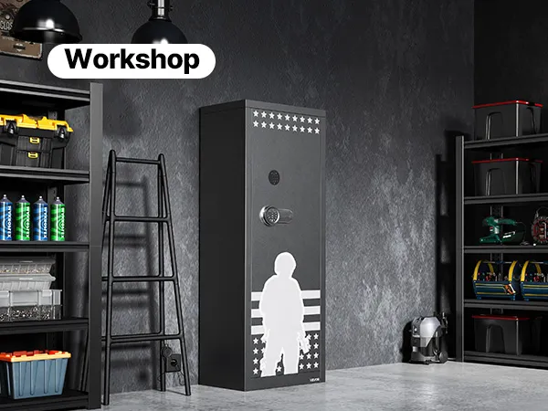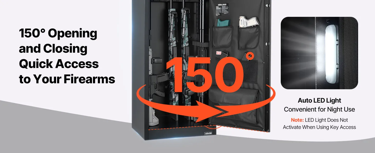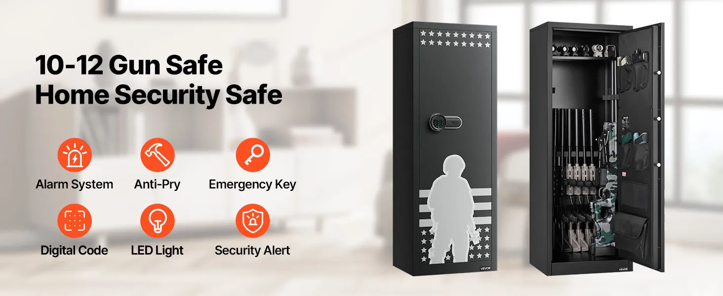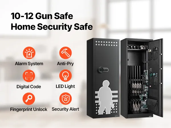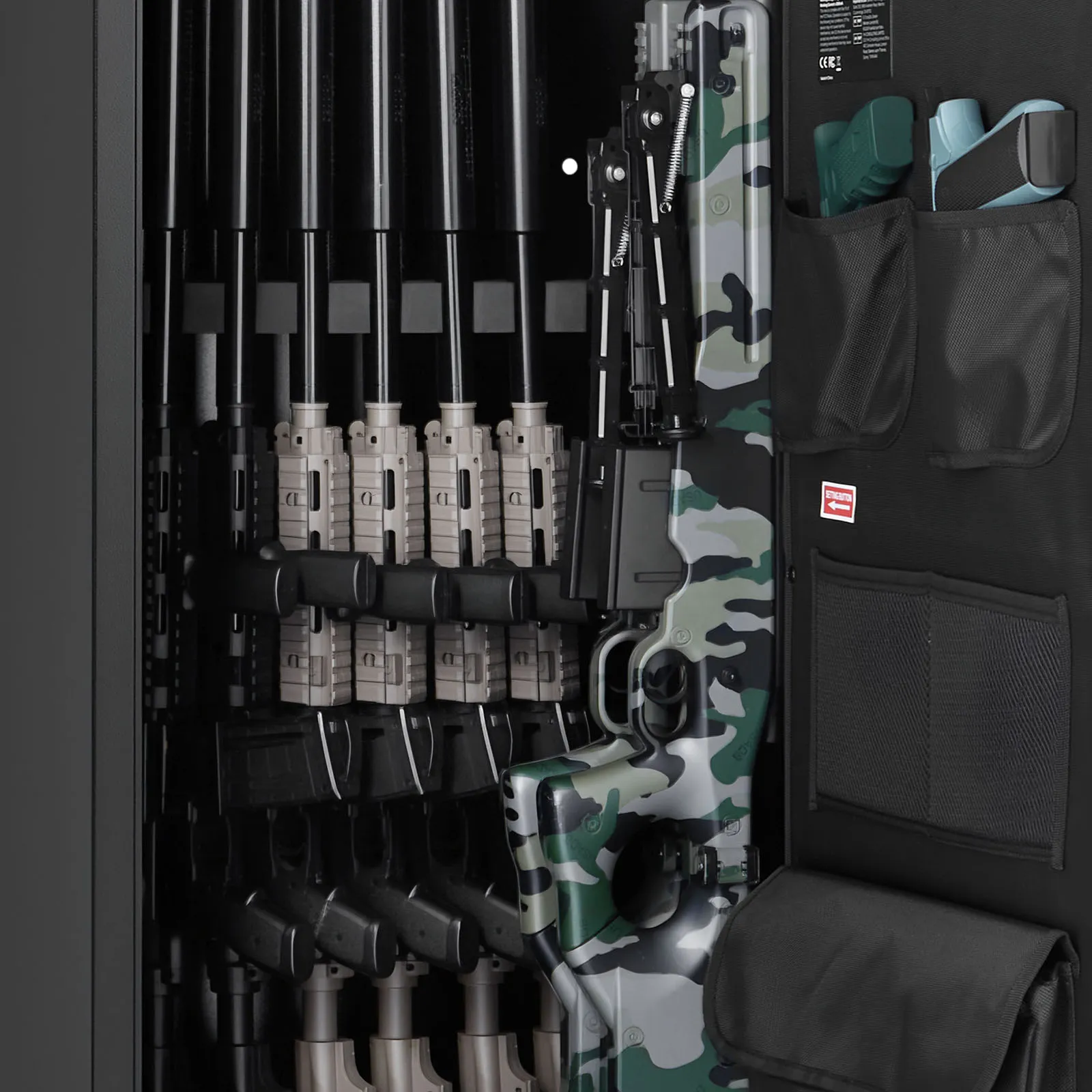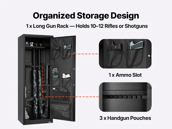 The gun safe can hold up to 10-12 rifles and 4 handguns, meeting the storage needs of heavy collectors and multi-gun users. It is equipped with adjustable racks to accommodate firearms of various lengths.