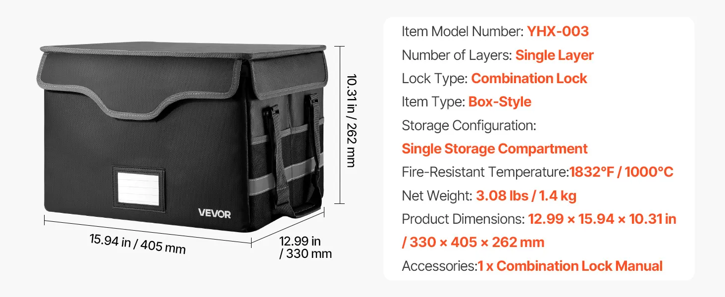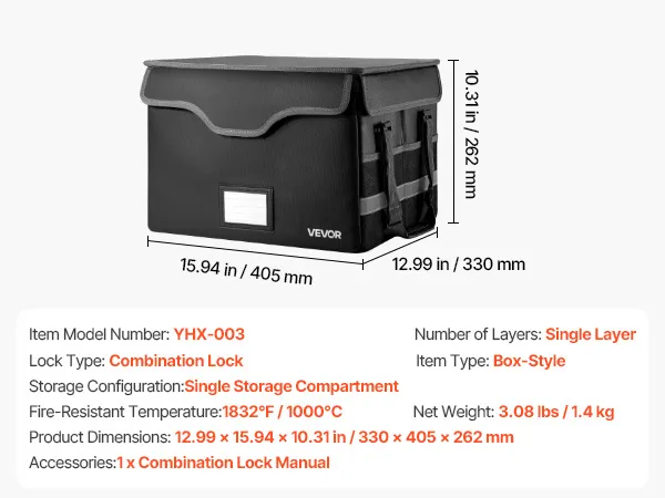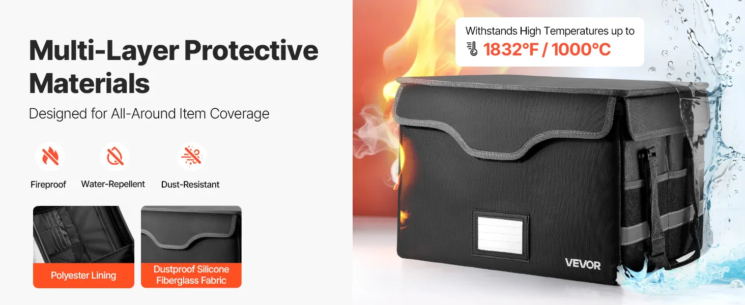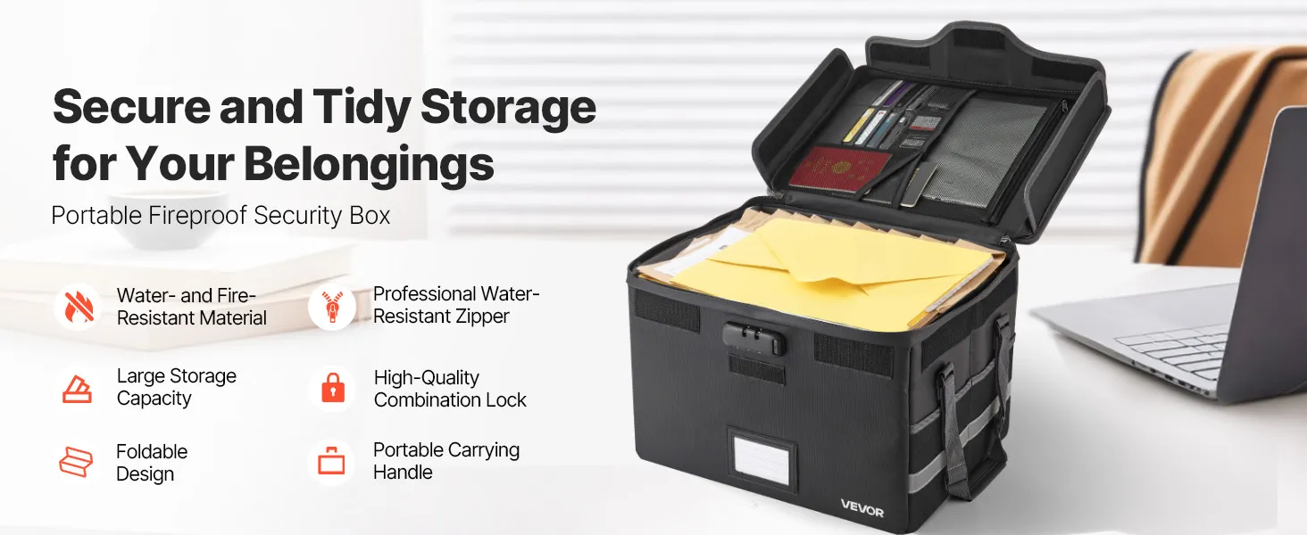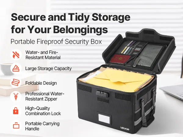 This fireproof box withstands 1832℉/1000℃ and keeps out water and dust. At 3.08 lbs/1.4 kg, it organizes files and devices with layered storage. The upgraded combo lock and waterproof zipper add extra security for valuables at home, office, or on the go.